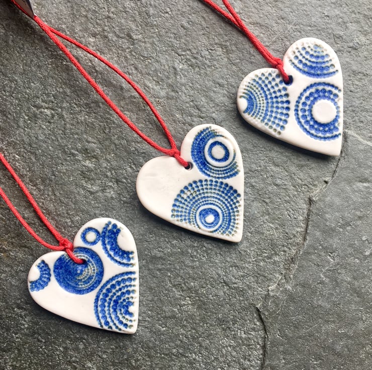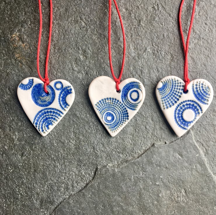 This listing is for a set of three porcelain hearts in the colours shown in the photographs. Please note the designs on each heart will vary as they are individual, hand made and decorated and none are exactly the same. Thank you.