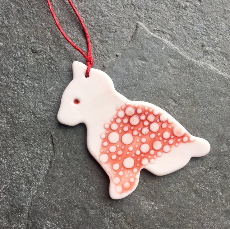 I make Kitty from fine porcelain, hand decorating and glazing her. She is hung on red cord ready to hand in your home, your gift, and then on your Christmas tree. Some cat lovers who have bought them can't bear to put them away after Christmas, and leave them out all year round and who can blame them?