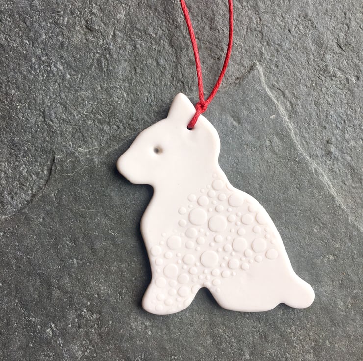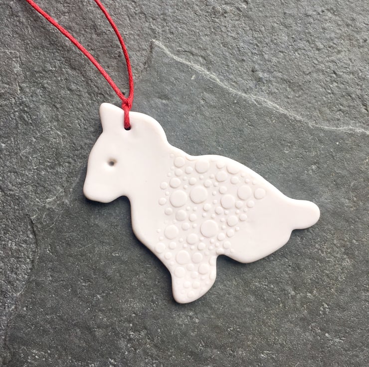 I make Kitty from fine porcelain, hand decorating and glazing her. She is hung on red cord ready to hand in your home or perhaps on your Christmas tree. Some cat lovers who have bought them can't bear to put them away after Christmas, and leave them out all year round and who can blame them?