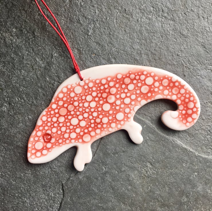 Your chameleon is made from fine white porcelain, with spotty textured skin, he is red glazed.