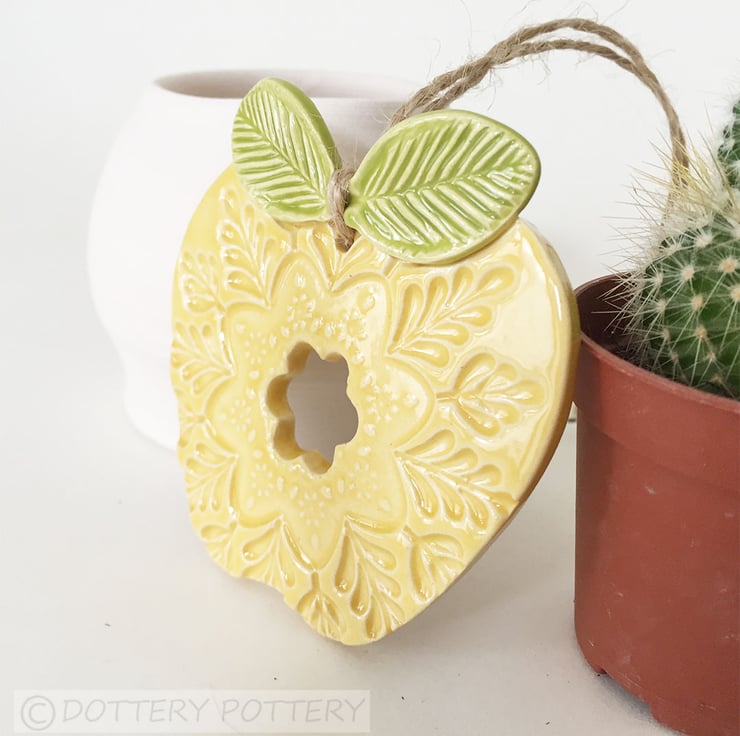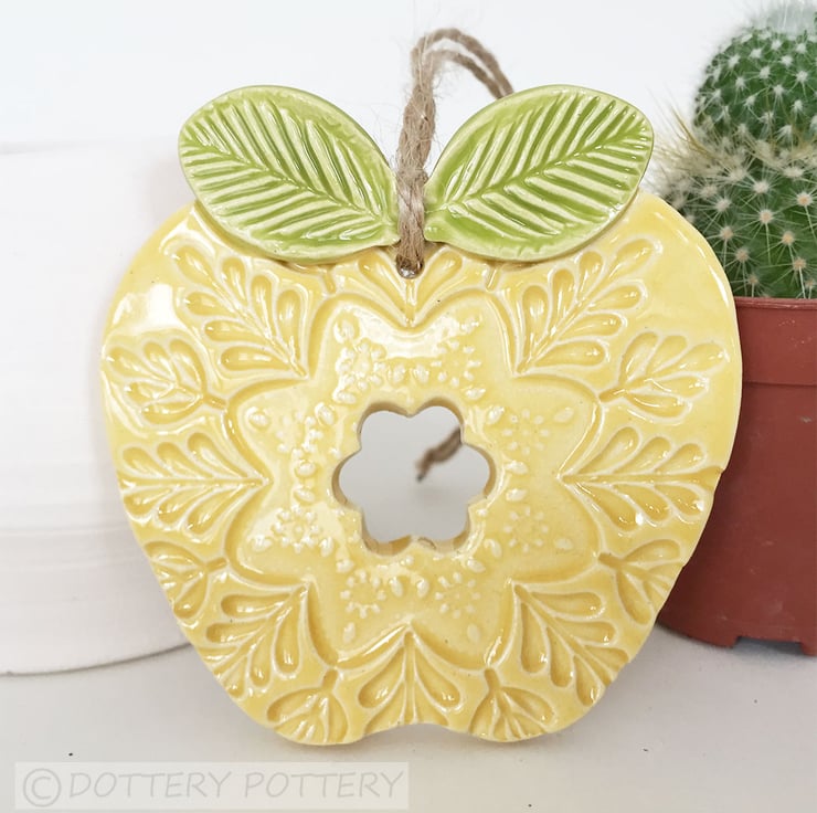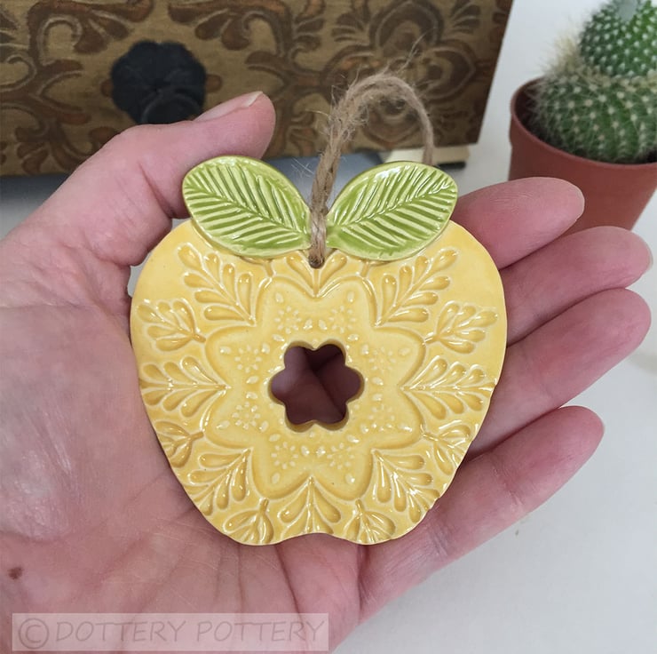 This cute little apple is hand cut from white earthenware clay and decorated with pattern. It has been fired once, a rich glossy glaze is applied and it is then fired again - so is nice and strong. This is the price for ONE apple. It measures 7.5cm x 7cm and hangs from a brown string. It is glazed on the front and left plain on the back.