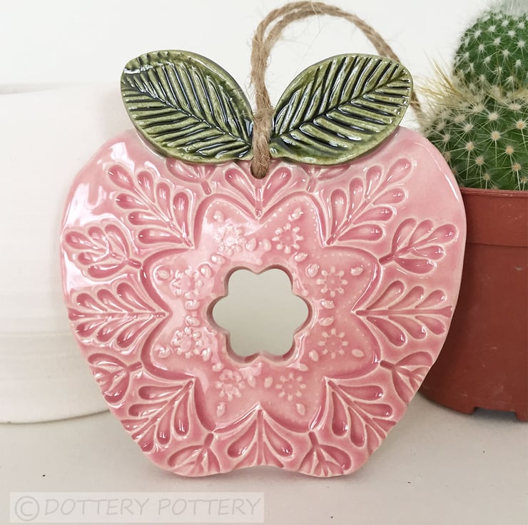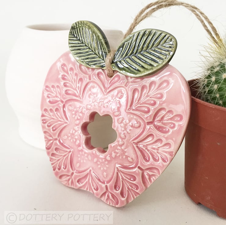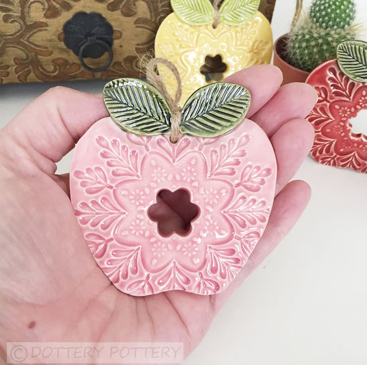 This cute little apple is hand cut from white earthenware clay and decorated with pattern. It has been fired once, a rich glossy glaze is applied and it is then fired again - so is nice and strong. This is the price for ONE apple. It measures 7.5cm x 7cm and hangs from a brown string. It is glazed on the front and left plain on the back.
