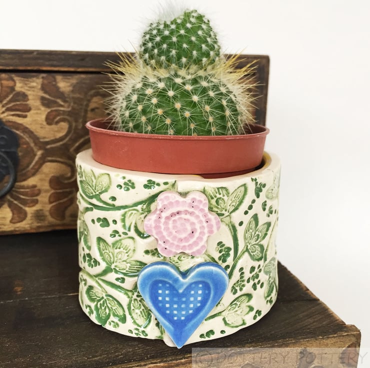 This hand built ceramic pot is made from earthenware clay. It has been hand built and decorated with pattern and embellishments. It has been fired twice in the kiln to a top temperature of 1100 degrees so it is nice and strong The perfect size for a little succulent or even for little trinkets or a tealight. This pot measures 4.5cm high x 6.5 cm wide
