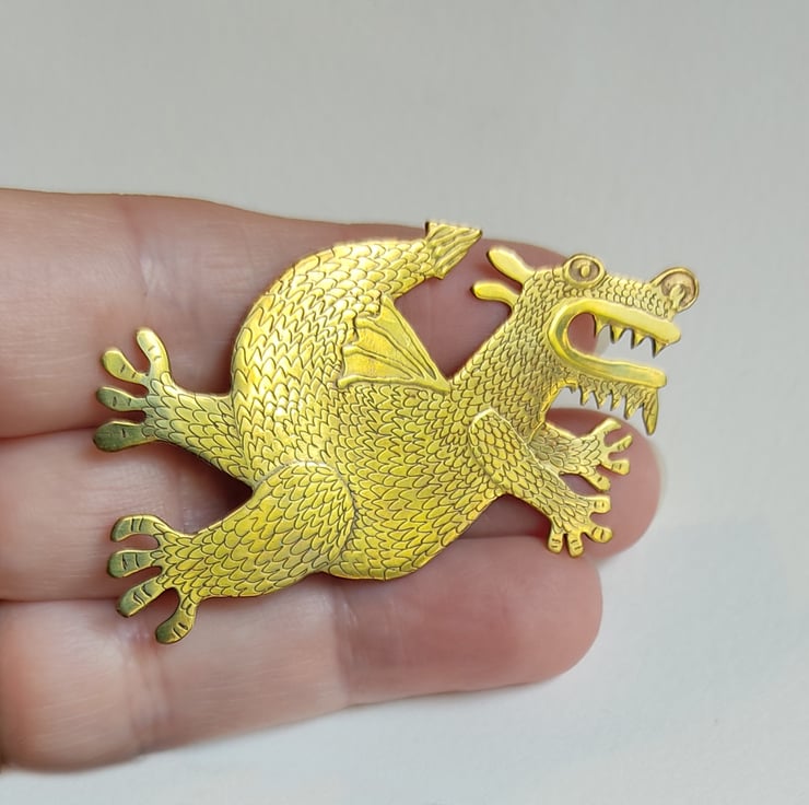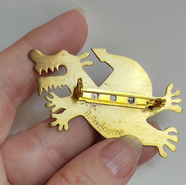 Nose to tail he is 6.3cms or about 2 1/4 inches long. I have signed the back with Hollowbourne. The brooch pin is soldered on and the brooch has a coat of lacquer.