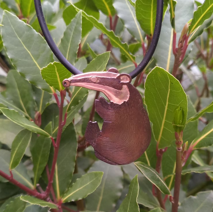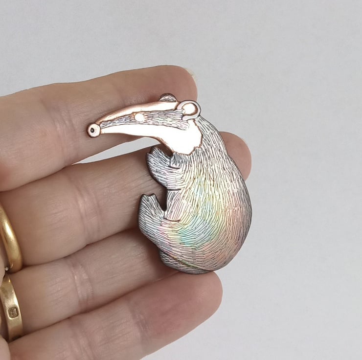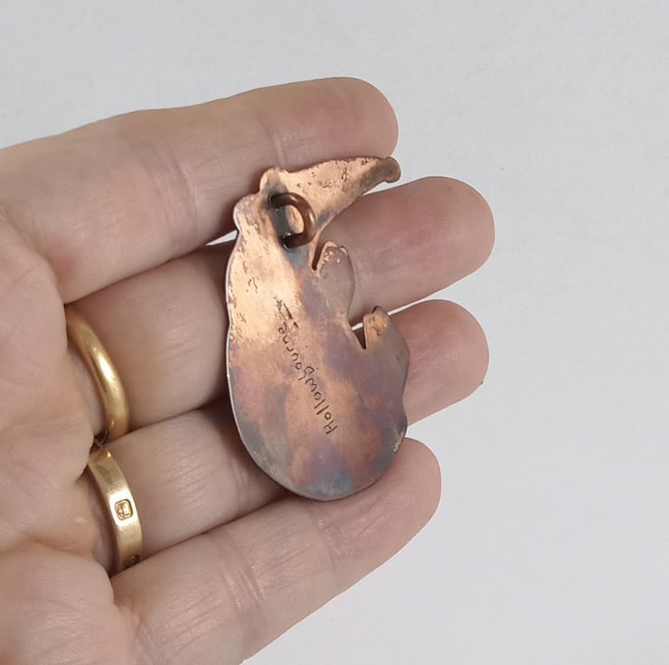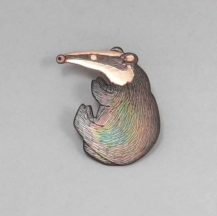 Cute hand etched copper badger with a dark patina.The colour varies depending on the light from dark brown so a sort of petrol blue in the middle.