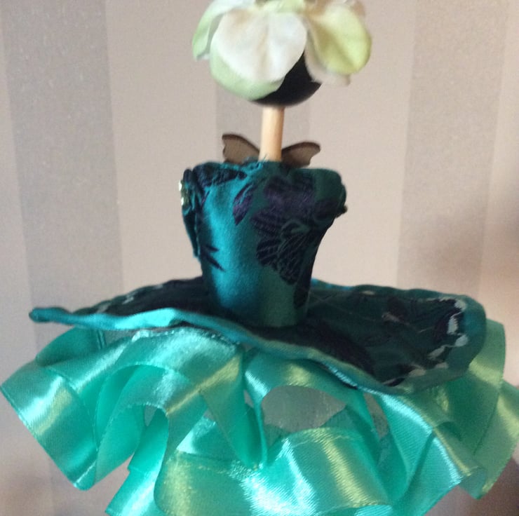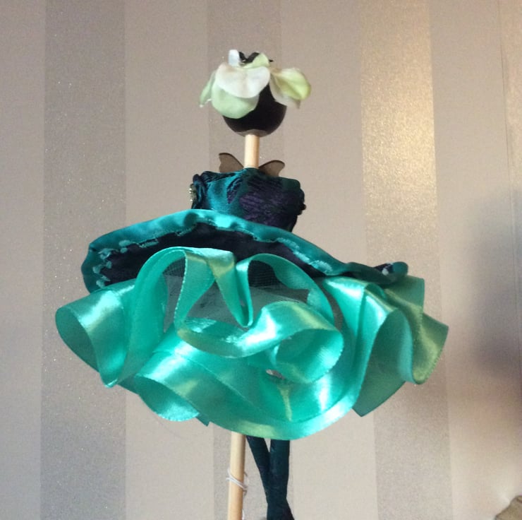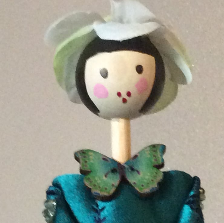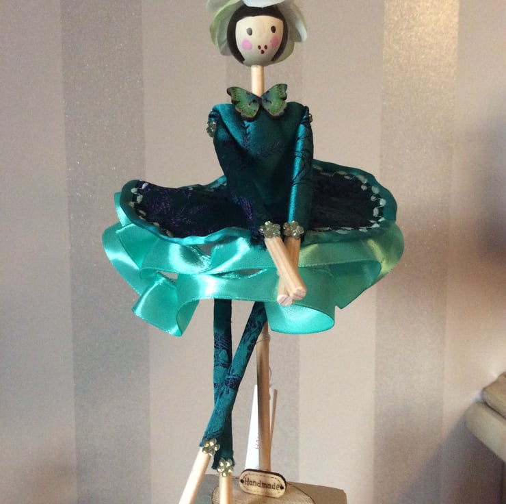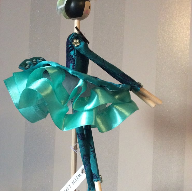 My name is Hallie and I’m so looking forward to meeting you. I stand approximately 27 cm and am wearing my beautiful bright Teal Ballerina dress edged in a teal ribbon with embroidered design with lots of a lighter coloured ribbon edging my net under-layers. I have a wooden head, arms and legs which have been hand painted and I just love my black bob hairstyle and pretty black ballerina slippers. My leggings match my dress and have lovely glass bead flowers at the knee.
