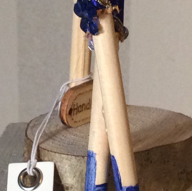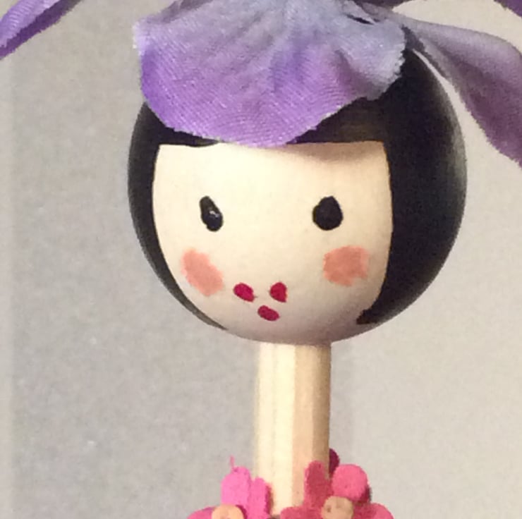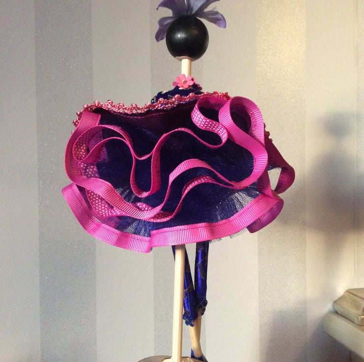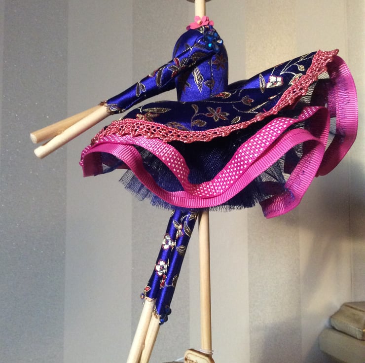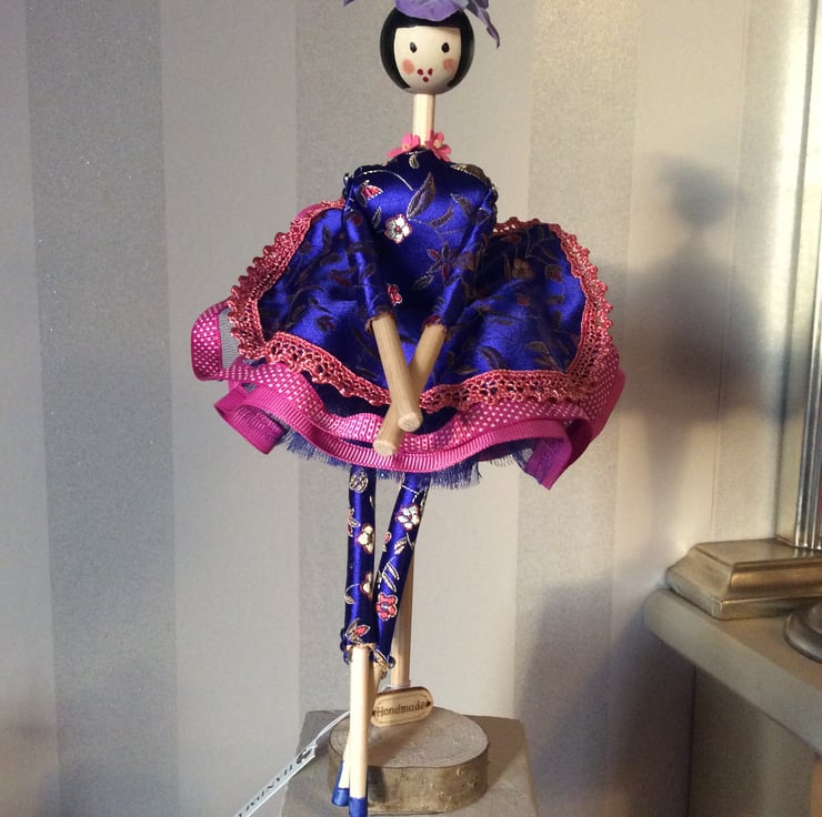 My name is Eva and I’m so looking forward to meeting you. I stand approximately 27 cm and am wearing my beautiful bright blue Ballerina dress edged in Pink lace with lots of Pink ribbon edged net under-layers. I have a wooden head, arms and legs which have been hand painted and I just love my black bob hairstyle and pretty blue ballerina slippers. My leggings match my dress and have lovely blue glass bead flowers at the knee.