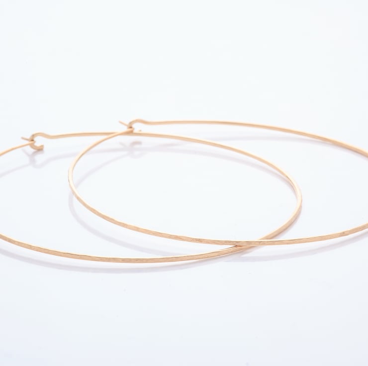 Handmade Gold Filled Extra Large Hoop Earrings are made from 16 gauge (1.25 mm) 14K Gold Filled Wire, hand forged and hand textured to approximately 75mm (3 inches) diameter. For the ear posts, they are hand filed to 20 gauge (0.8mm) for a comfortable fit. The Earrings have been tumbled for strengthening and a polished, smooth finish.