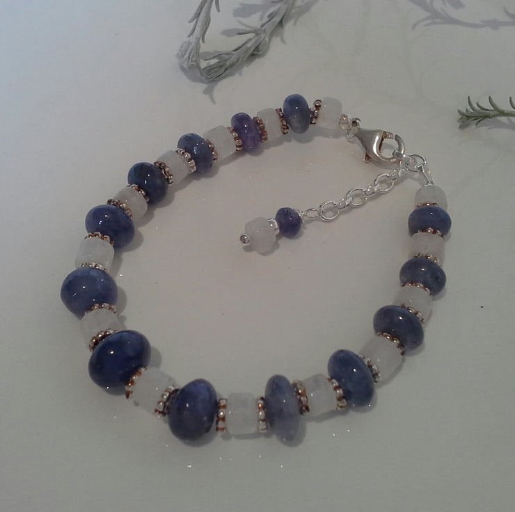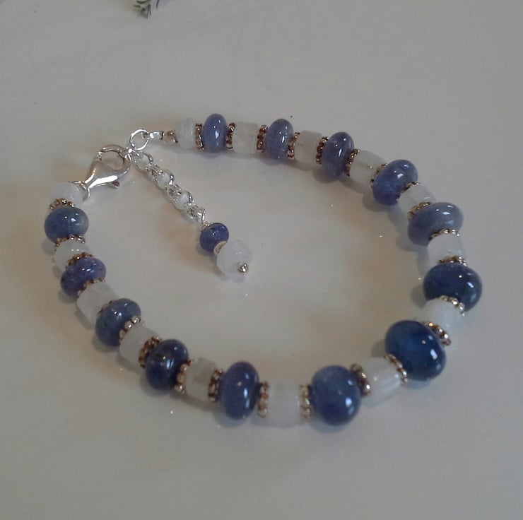 A very rare opportunity to own a distinctive eye catching bracelet designed and hand crafted by myself using top qualuty bead grade large graduating Tanzanite rondelles totalling 40cts with 15cts quality moonstone from Sri Lanka. Between each genuine gemstone is a flat decorative sterling silver bead finished off with a heavy duty sterling silver belcher style extender chain and bolt ring clasp. For the main construction I have used professional stainless steel coated jewellers wire for added strength and lasting durability.