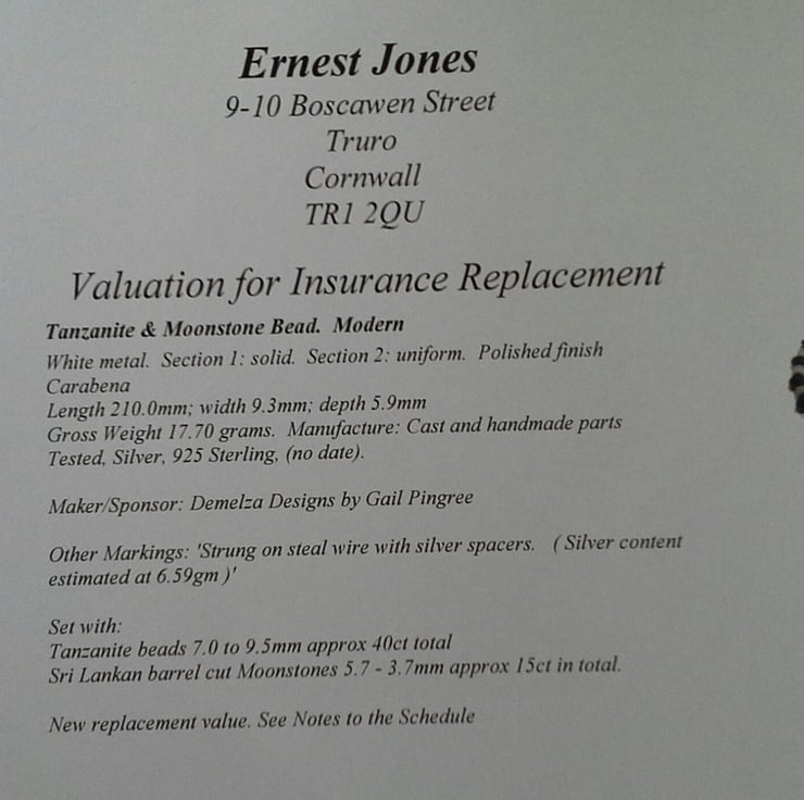 This item has been professionally appraised and valued for insurence purposes by a GIA gemstone geomologist on the 26.07.2019 via Earnest Jones Jewellers. It's new replacement value iscurrently valued at £450.00 and the item is registered with the insurance industries official government website at www.gvj.org.uk as an original Demelza Designs product.