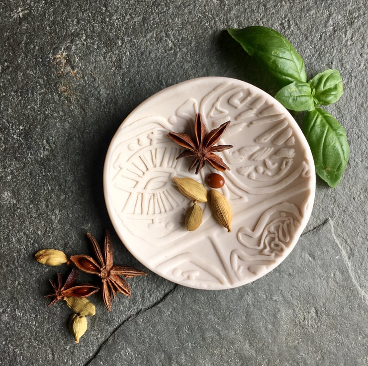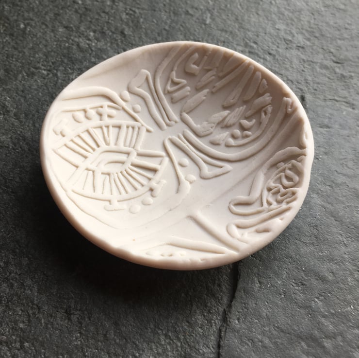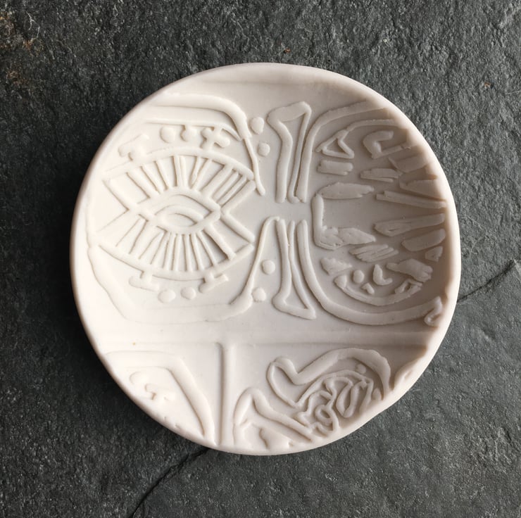 I love porcelain and am inspired by the ceramic designs of the 1950's from Denmark. This design is inspired by a tile on a retro coffee table. The surface has a raised printed pattern, and these little dishes are high fired to stoneware temperatures.