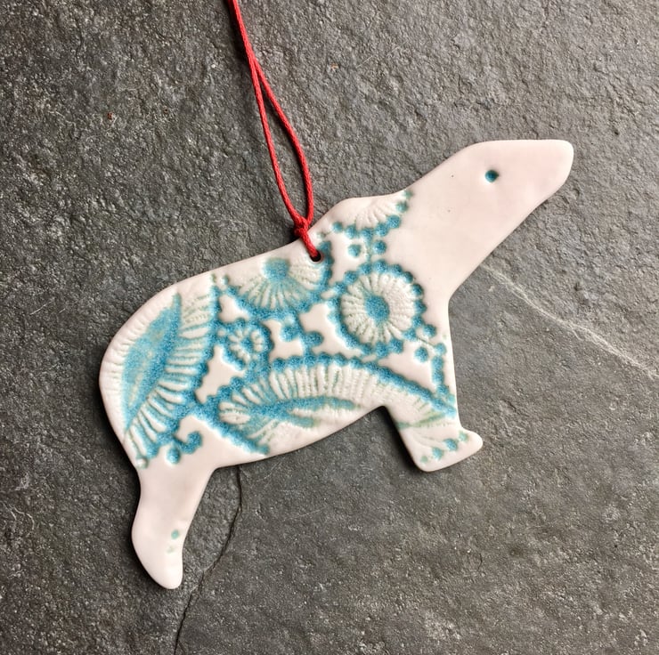 This delightful polar bear is made from high fired porcelain, and hand decorated and finished with a striped cord ready to hang up.