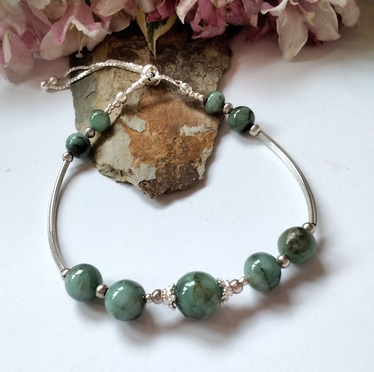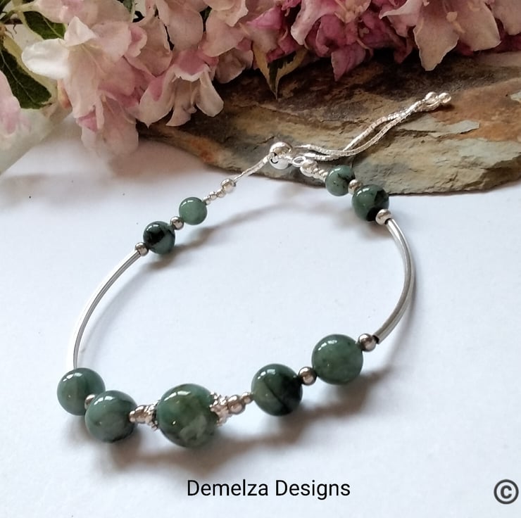 The brangle will make a very special gift for ladies of all age groups whom value and appreciate unique genuine emerald gemstone jewellery which has not been mass produced. It is adjustable using the small button on the round sterling silver slidder adjuster which has a cilicon inner centre for ease of movement and to keep the bangle at it's desired length around the wrist during wear.