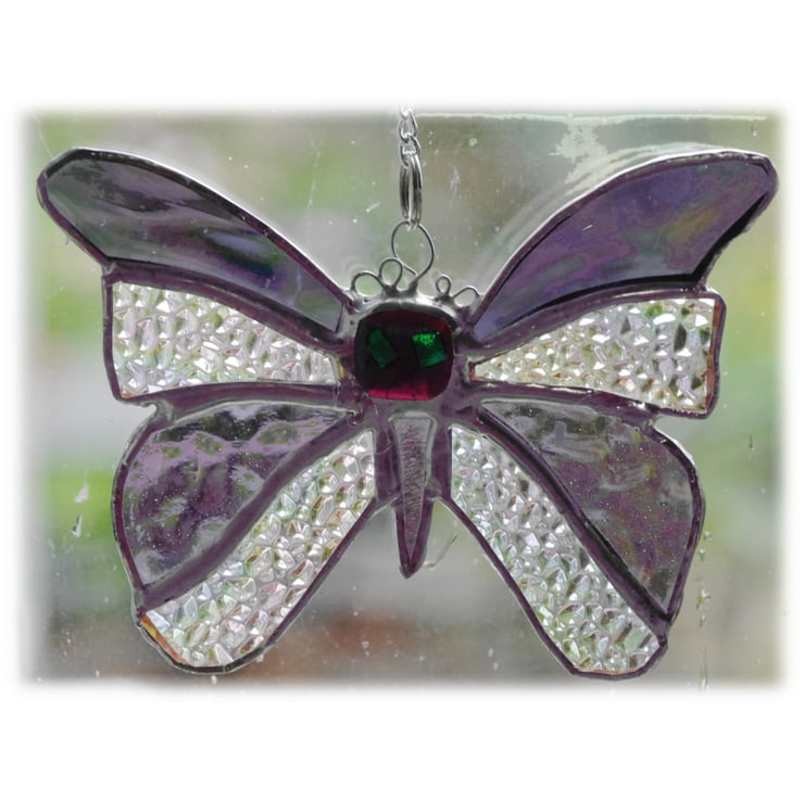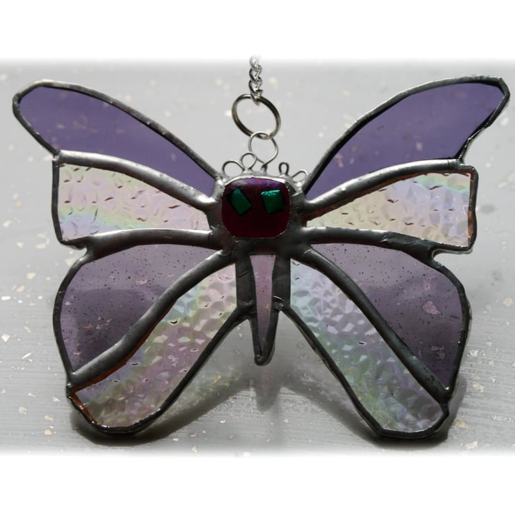 A butterfly made from Amethyst, purple glass, amethyst being the UK birthstone colour for February. The other sections of the butterfly are iridised textured clear glass to give it extra shimmer.