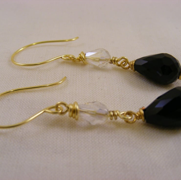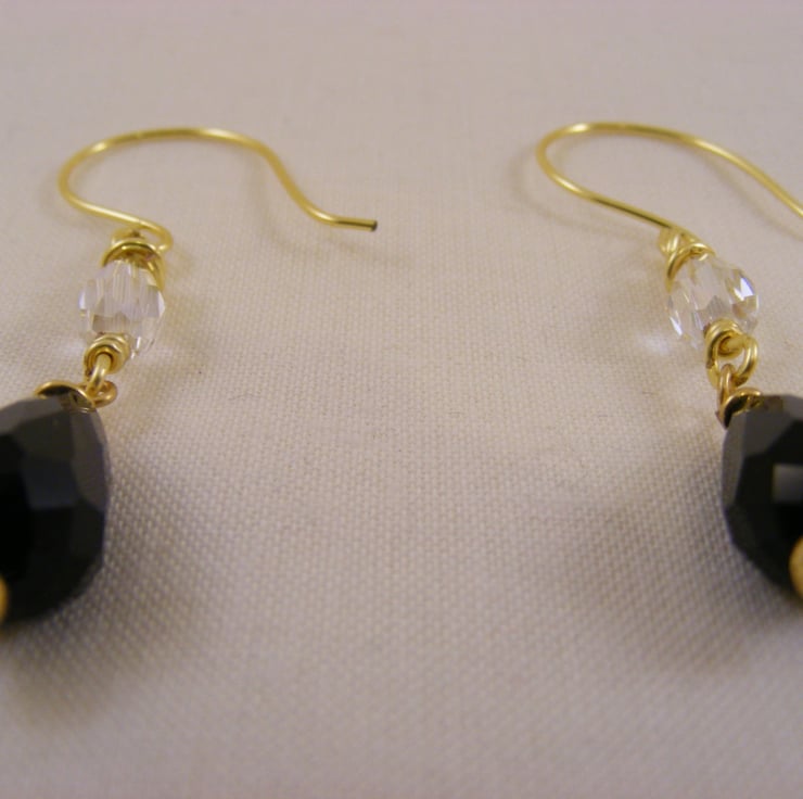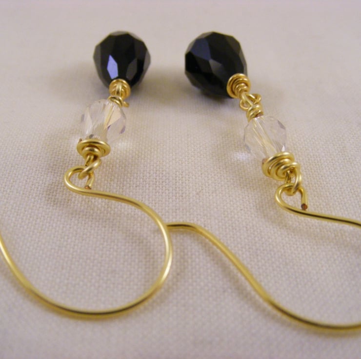 Earrings are made with 12 x 10 mm black faceted glass drops, 6 x 5 mm clear faceted glass drops, gold plated headpins and wire. Ear wires are handmade.