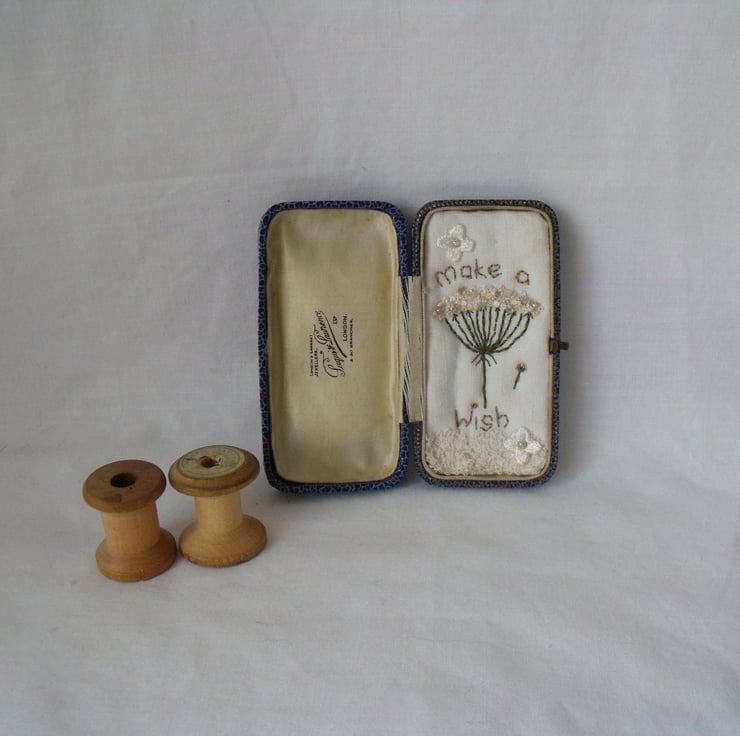 I've embroidered the wording and decorated it with vintage lace, seed beads and embroidery