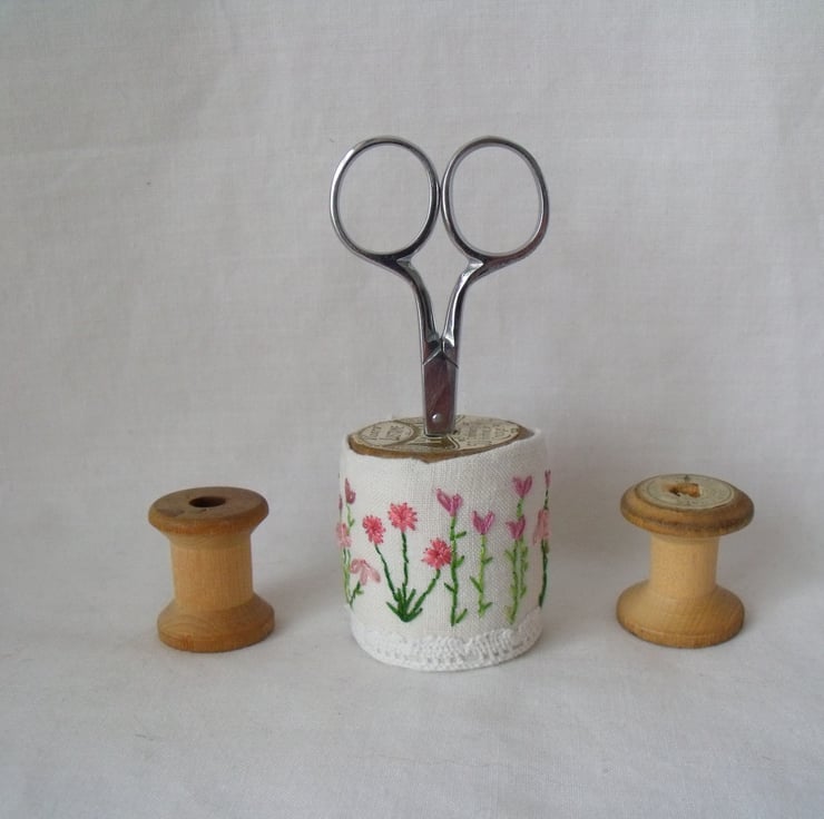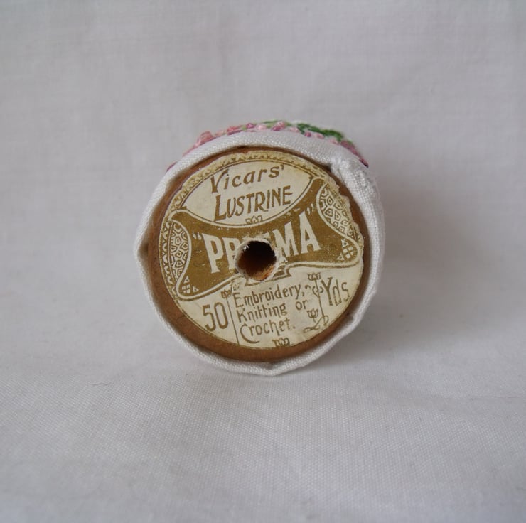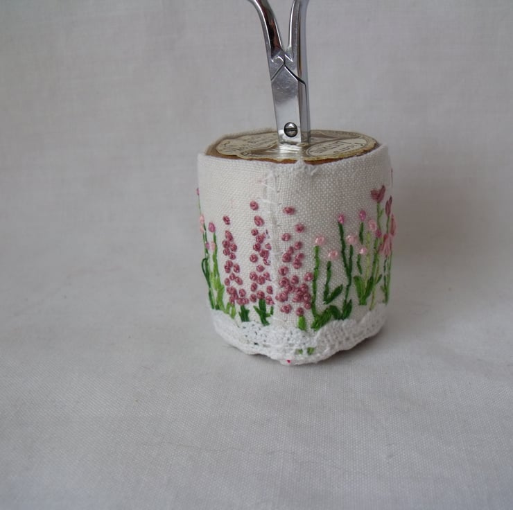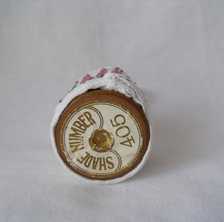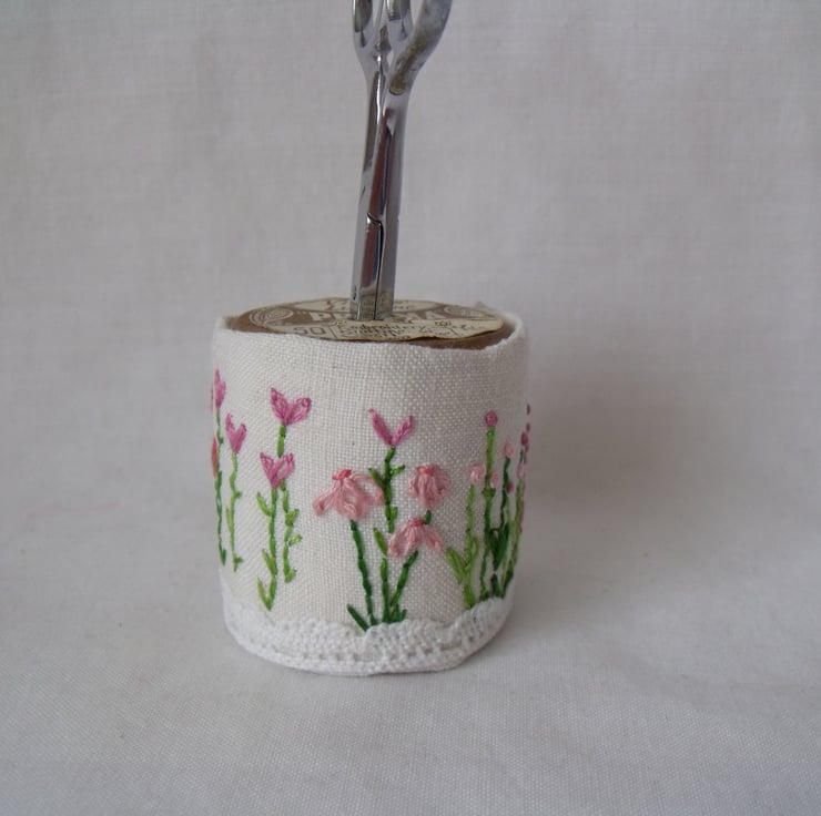 I've embroidered delicate flowers onto vintage fabric and wrapped it around a vintage wooden bobbin.