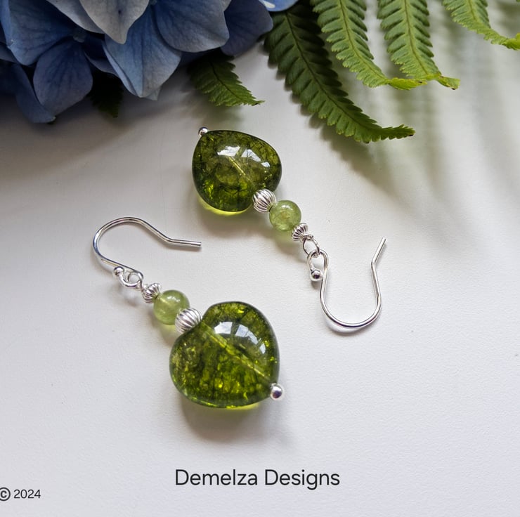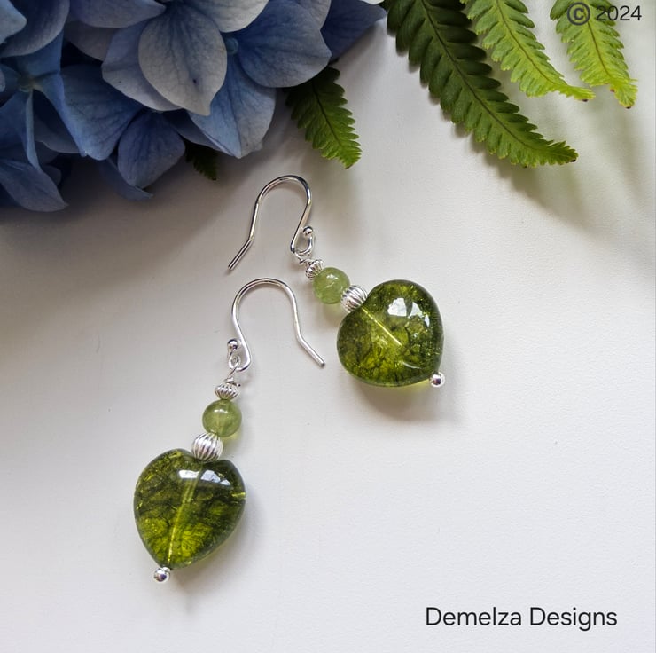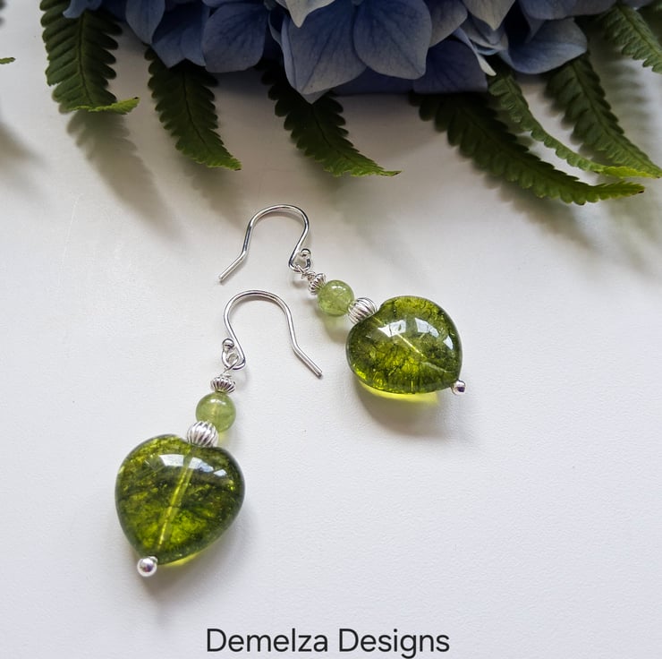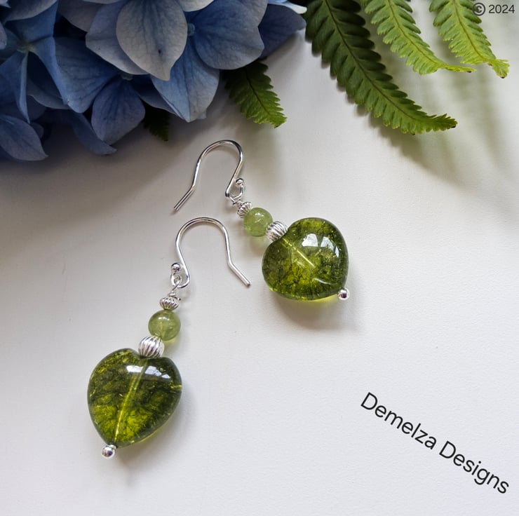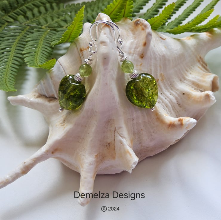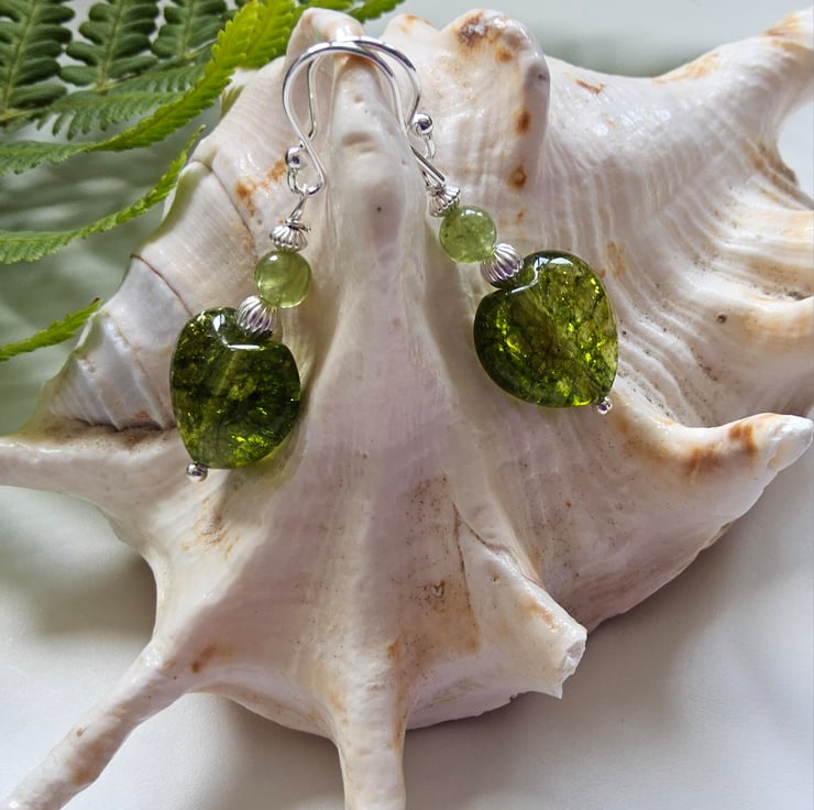 A sweet feminine pair of earrings designed and hand crafted using 15mm by 15mm hand cut heart peridot with 4mm small peridot rounds. The peridot used is of exceptional quality and when any light source hits them they come alive and literally glow. They have been hand constructed using all 925 sterling silver components.