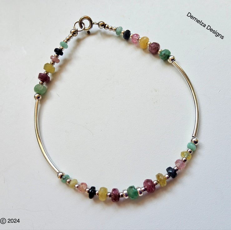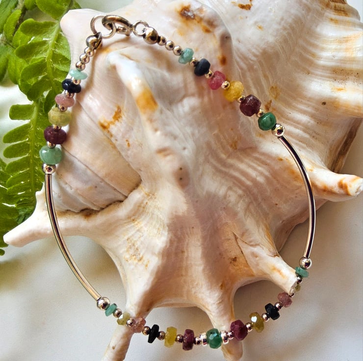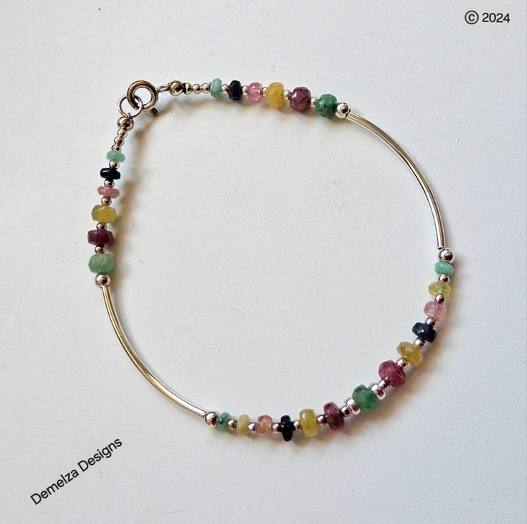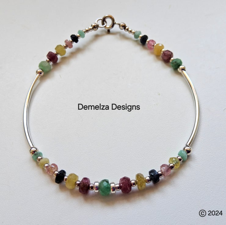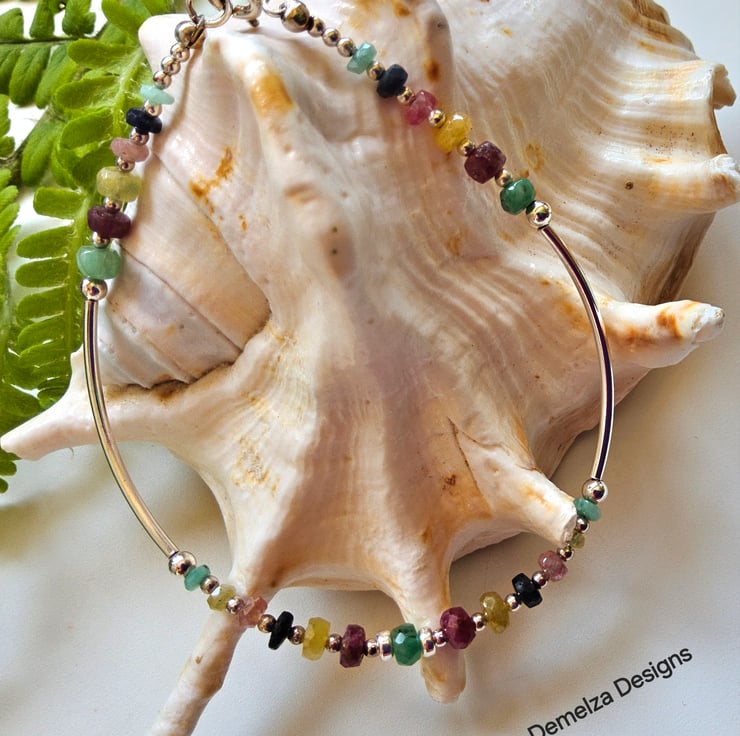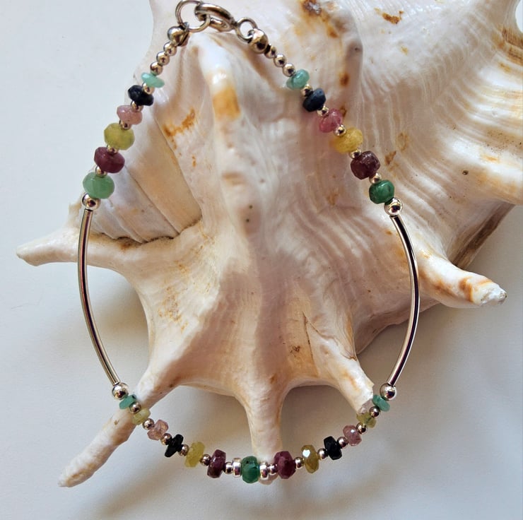 This sweet feminine noodle style bangle bracelet has been designed and hand crafted using a mix of free faceted ruby, sapphire and emerald rondelle cut gemstones. All outer components are 925 sterling silver. For the main construction professional stainless steel coated jewellers wire has been used for added strength and lasting durability for daily wear, finished off with a 925 6mm bolt ring clasp.