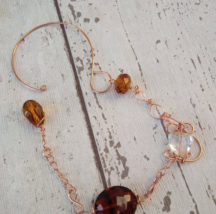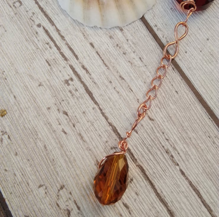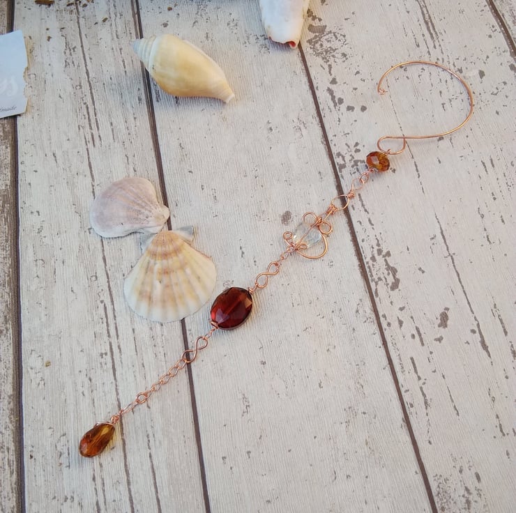 A unique and logo window suncatcher with rose gold plated wire and chain with bronze, copper and clear beads.