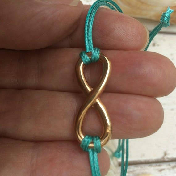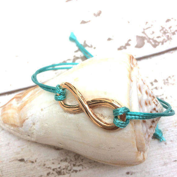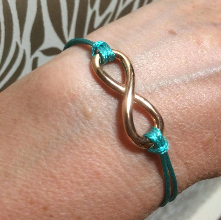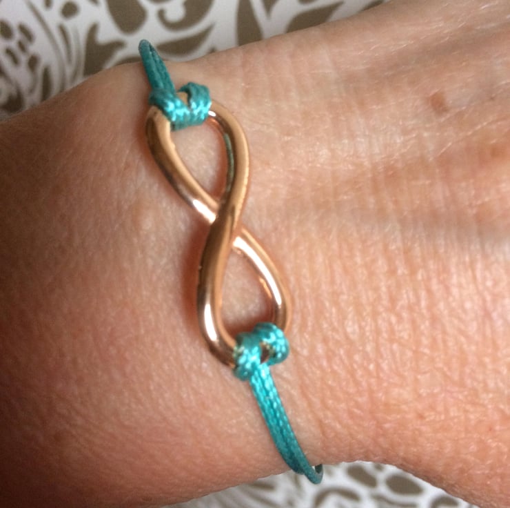 Rose Gold Plated Infinity Bracelet with turquoise cord.