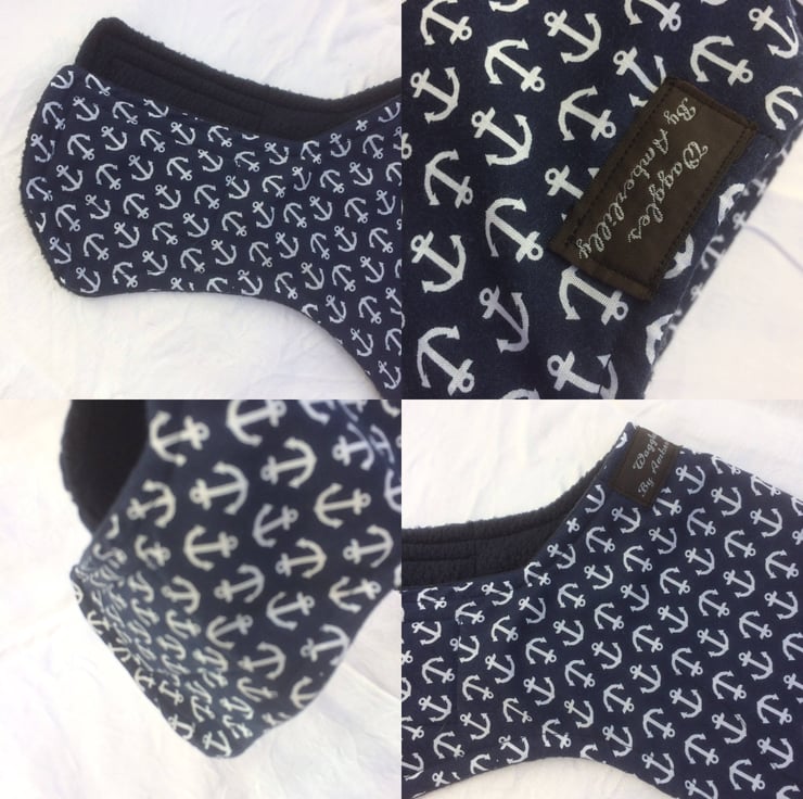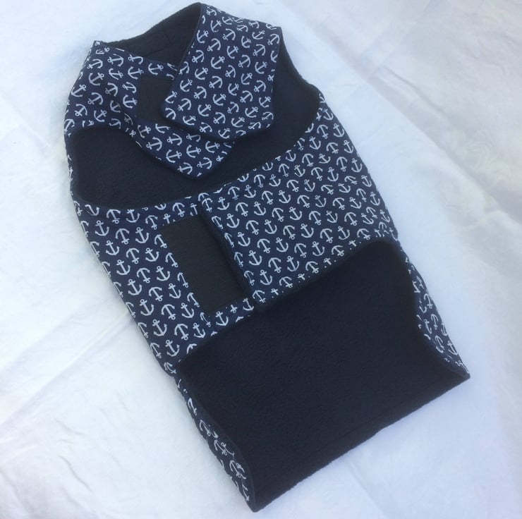 A gorgeous little jacket with polycotton dark blue and white anchor design and dark blue fleece lining.