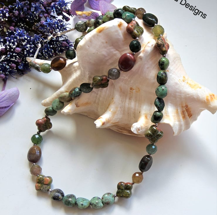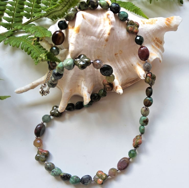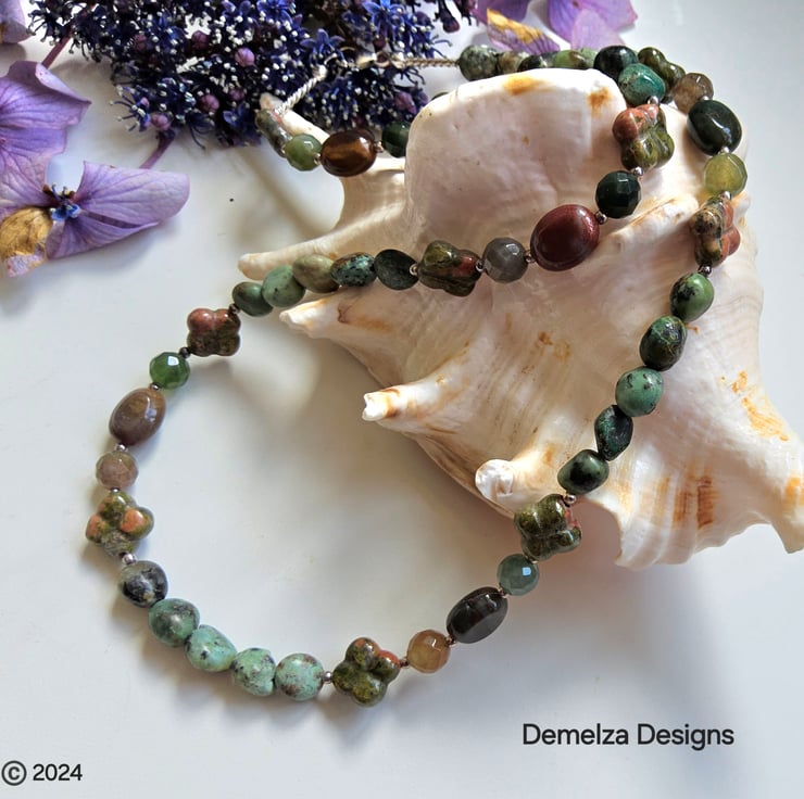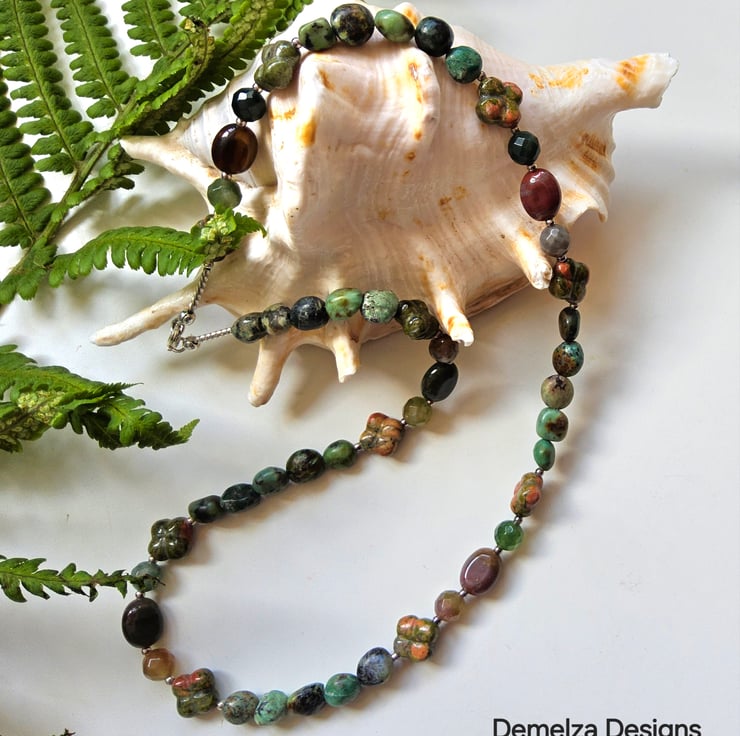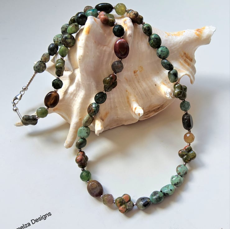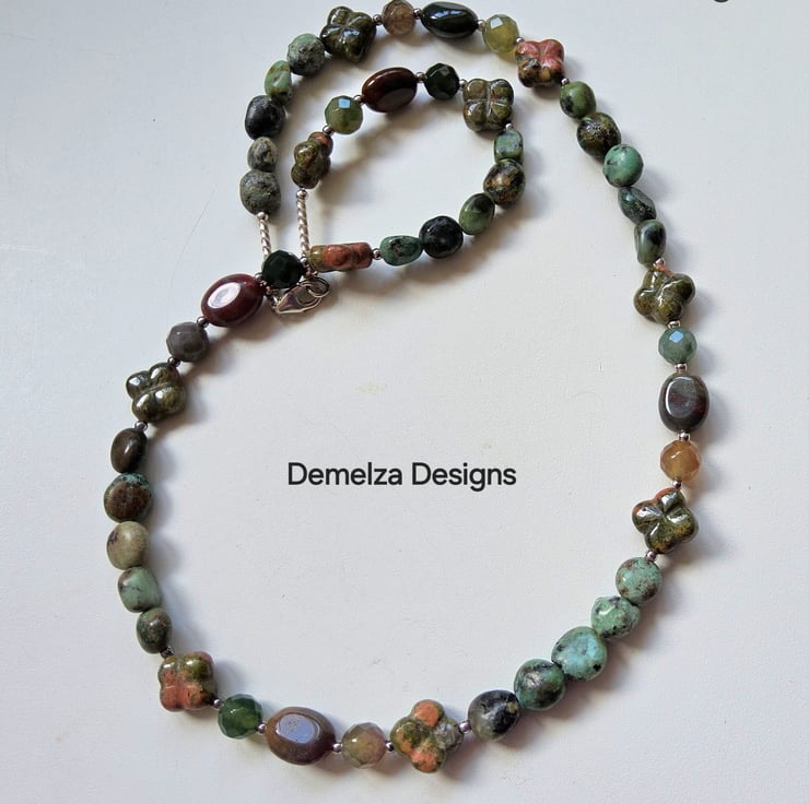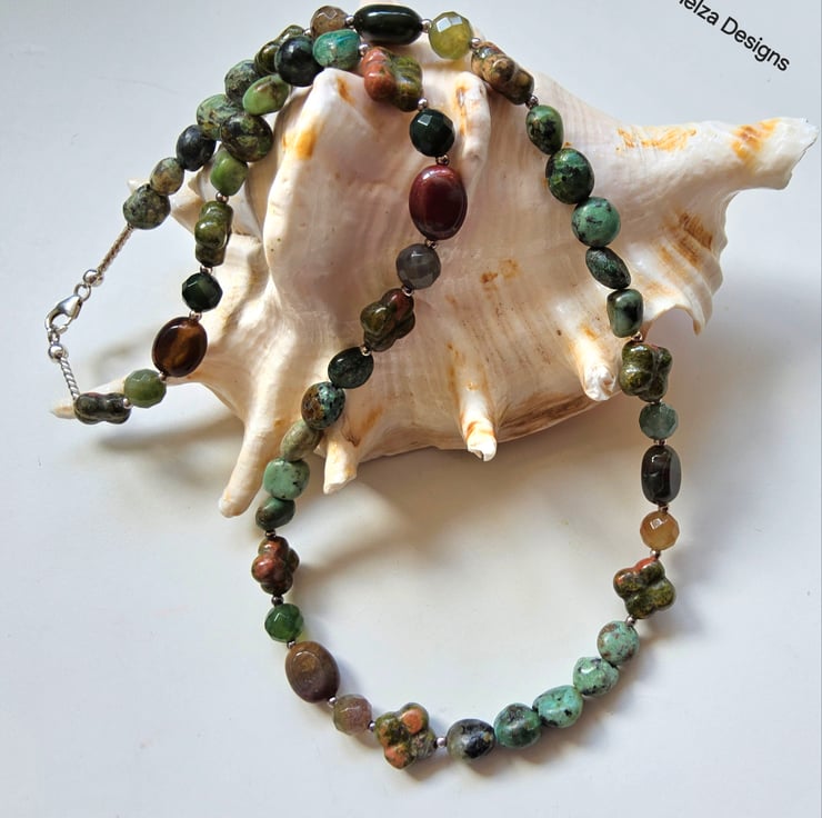 A very organic looking necklace designed and hand crafted using genuine irregular rectangle cut unikute, pebble shaped stabilised African turquoise and faceted round jasper gemstones. Between the pebble turquoise are 2mm sterling silver beads to add a touch of sparkle during wear. For the main construction I have used professional stainless steel coated jewellers wire for added strength and lasting durability for everyday wear, finished off with a 925 sterling silver bolt ring clasp and crimp covers.