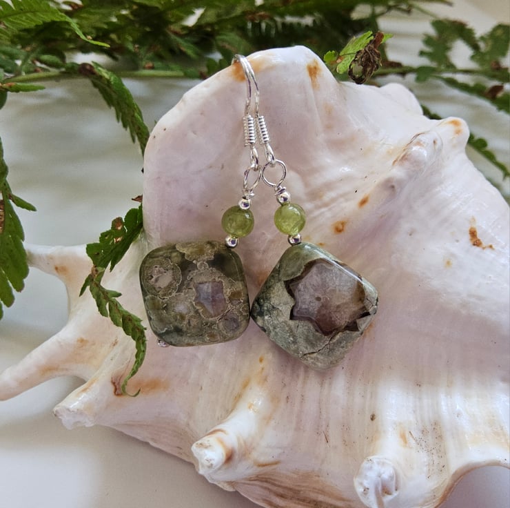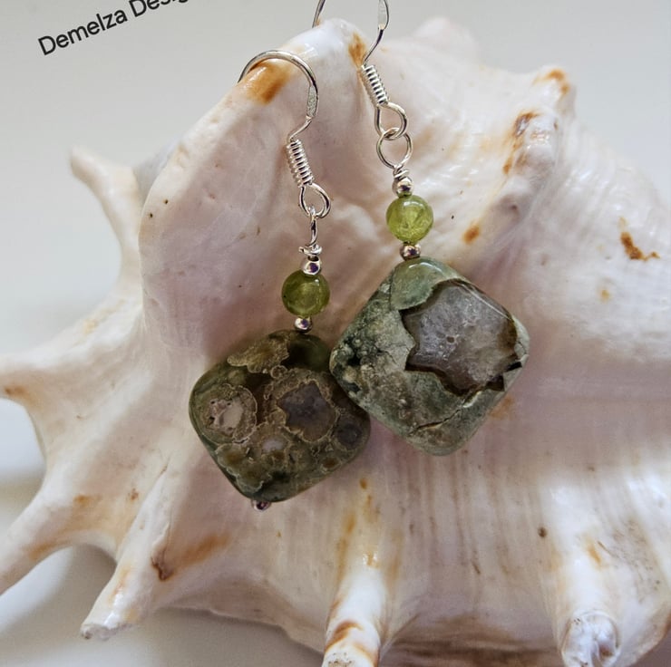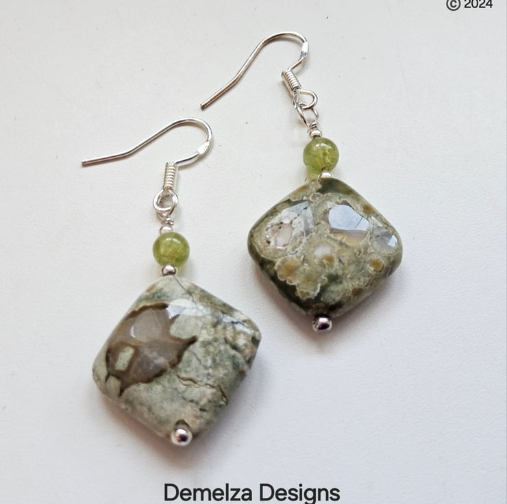 A casual pair of earrings for everyday wear designed and hand crafted in Cornwall using 12mm jasper off centre drilled puffy squares complimented with 4mm peridot round gemstones. They have been crafted using all 925 sterling silver components.