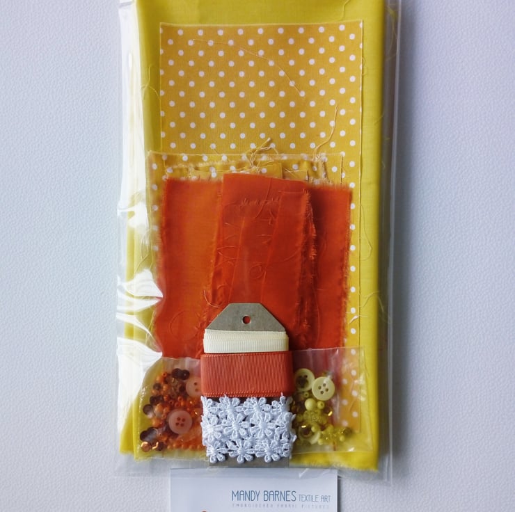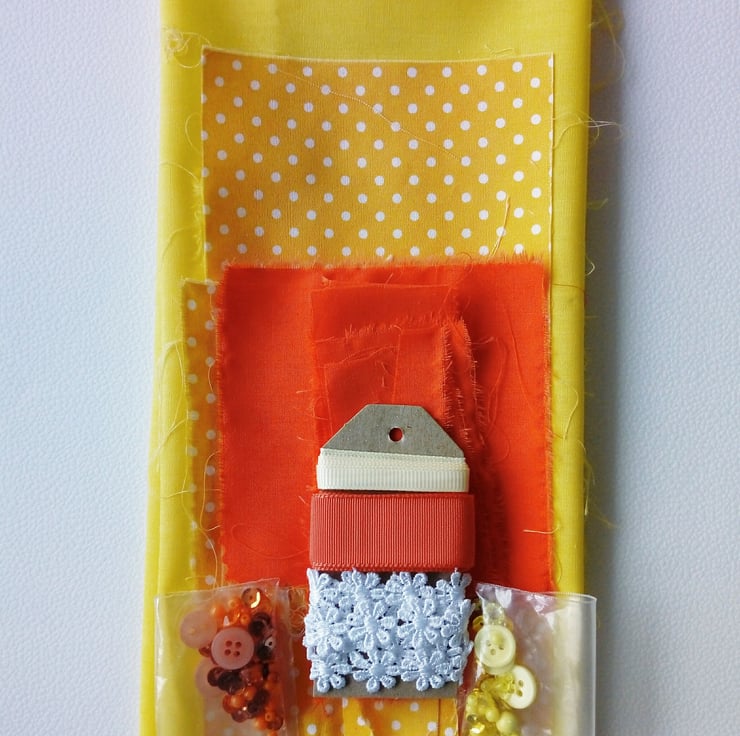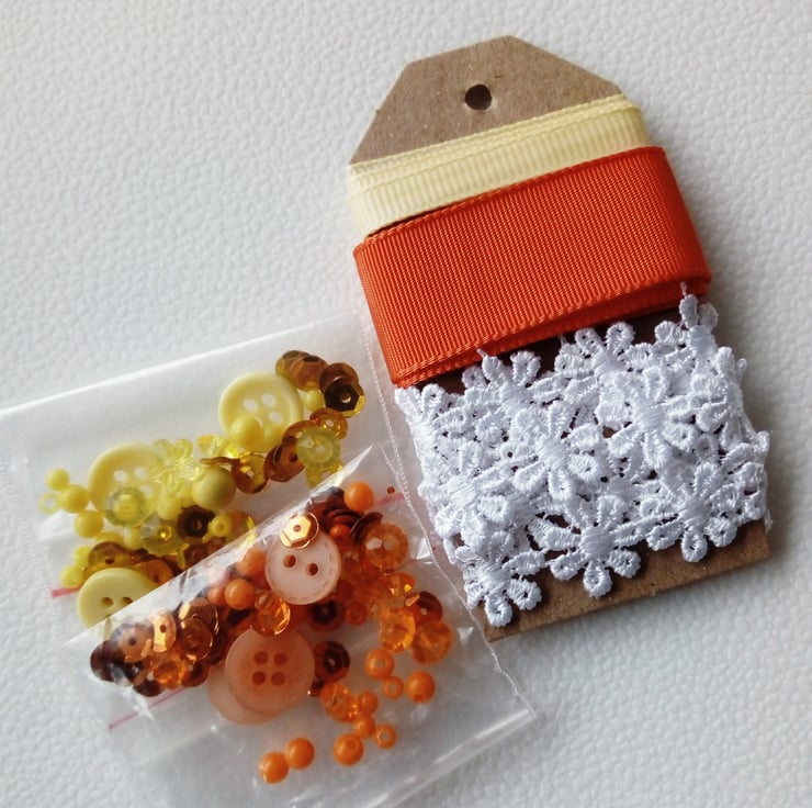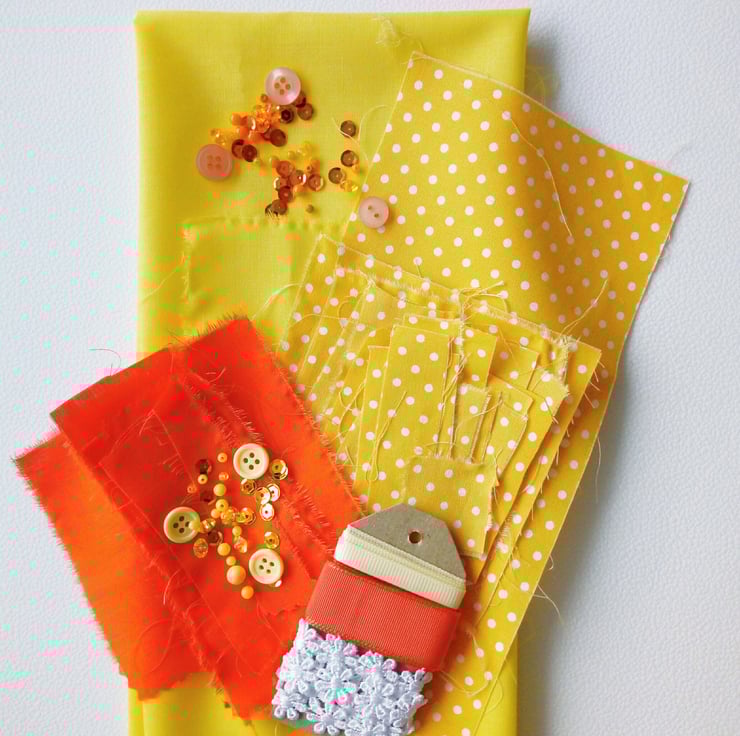 This bright, vibrant, zingy coloured, fabric scraps pack includes a mix of fabric pieces in varying sizes, plus, half metre length of pretty daisy trim, half metre each of orange and lemon ribbons and a selection of other embellishments including buttons, beads, and sequins, all in the same colour theme. All carefully selected to co-ordinate beautifully together in your own textile project.