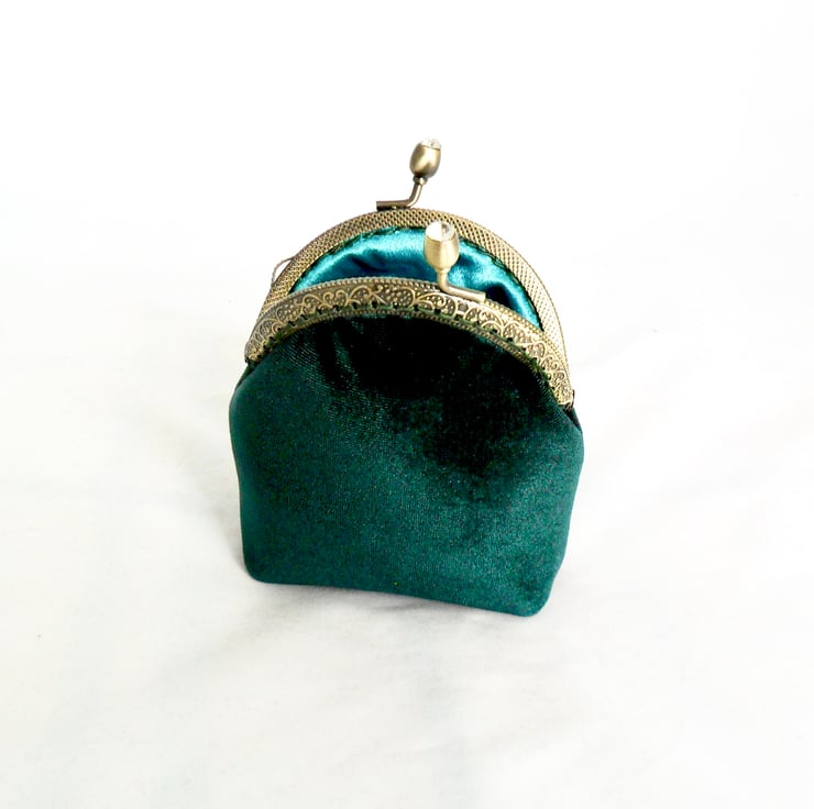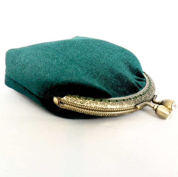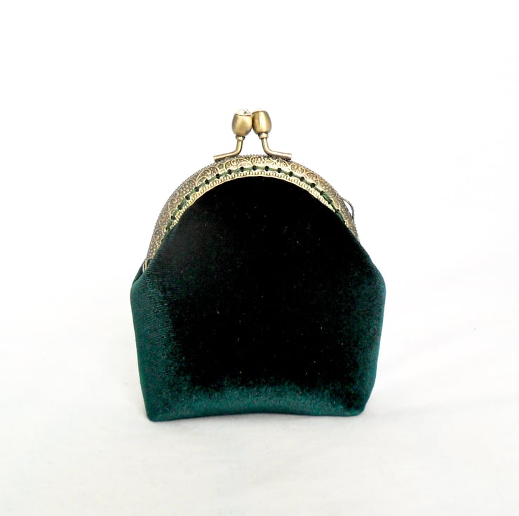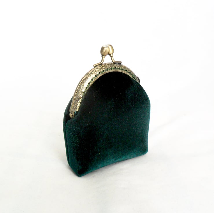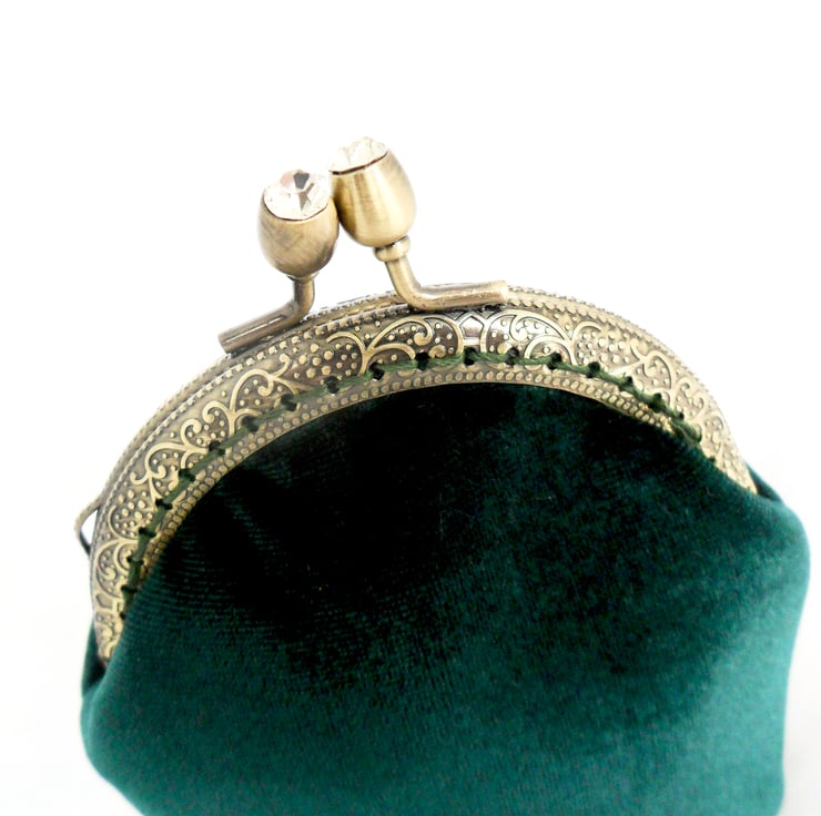 Handmade in a beautiful dark green velvet, this coin purse would make a lovely gift for someone special. The lining is a green satin and the purse itself is both glued and sewn into the bronze frame. The diamanté beads on the kiss lock clasp give the purse a glamorous appearance. Perfect for special occasions.