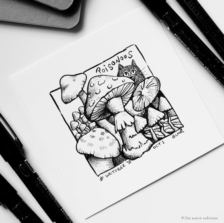 Poisonous - Day 1 Inktober 2018 - Mini Cat & Fungi Ink Drawing