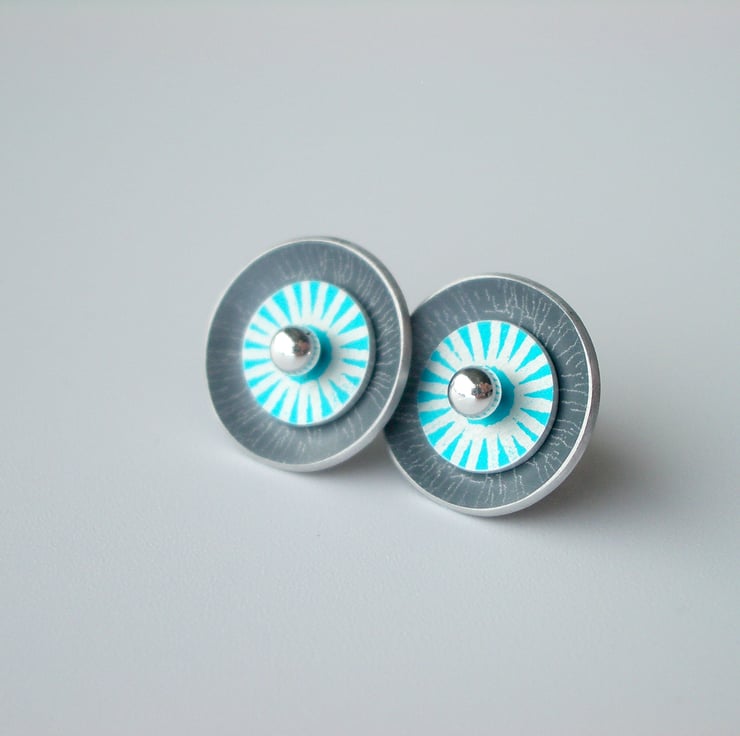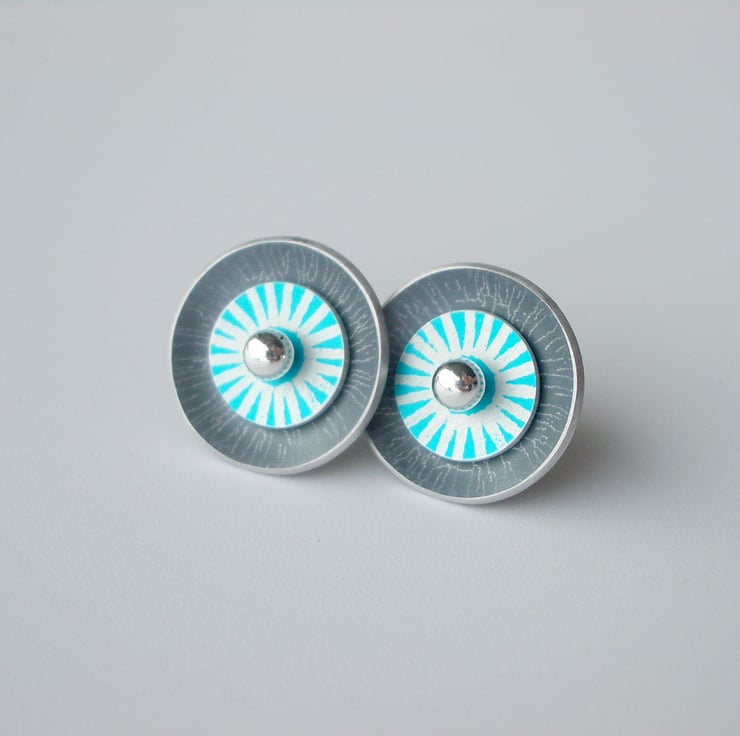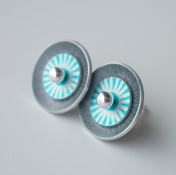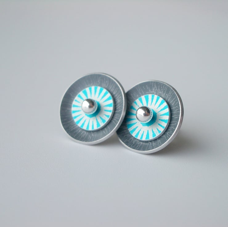 These little circle earrings are made from aluminium which I have dyed in grey and turquoise. I then seal the dye in so that it becomes a permanent part of the metal. Each circle is cut out by hand using a piercing saw and then domed so that they catch the light. As aluminium can't be soldered, they are fed onto a sterling silver ear post, when worn the pressure from the butterflies at the back hold the two circles in place.