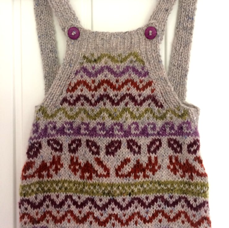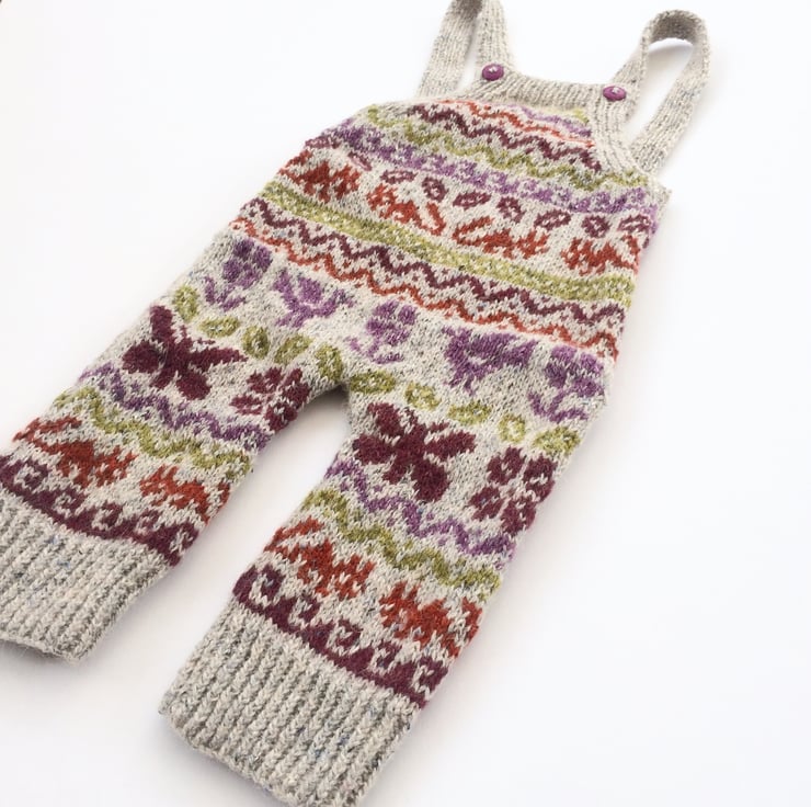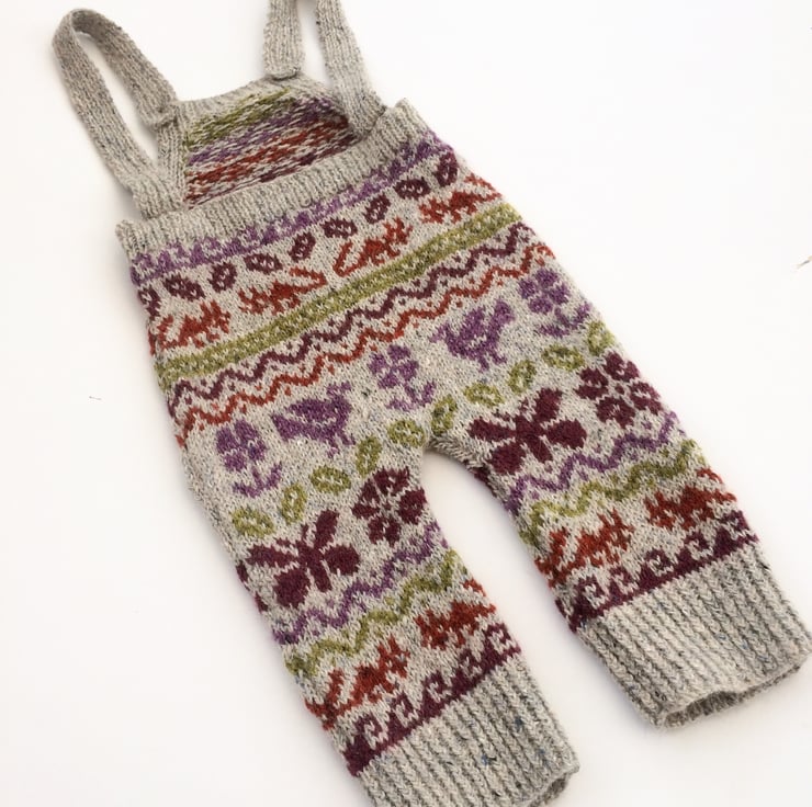 Knitting Pattern for 6 - 12 months old baby dungarees in a colourful playful Fair Isle pattern The pattern is colourful & full of childish character, with chevron waves, cute animals, insects and flowers.This is an intermediate knit.