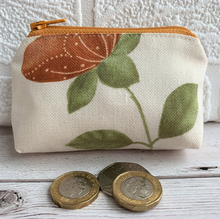 A lovely small purse in cream fabric with a lovely warm terracotta coloured flower on a green stem with green leaves. The coin purse has a golden ginger coloured zip and is lined with cream fabric. The base of the purse is boxed to give extra room inside.