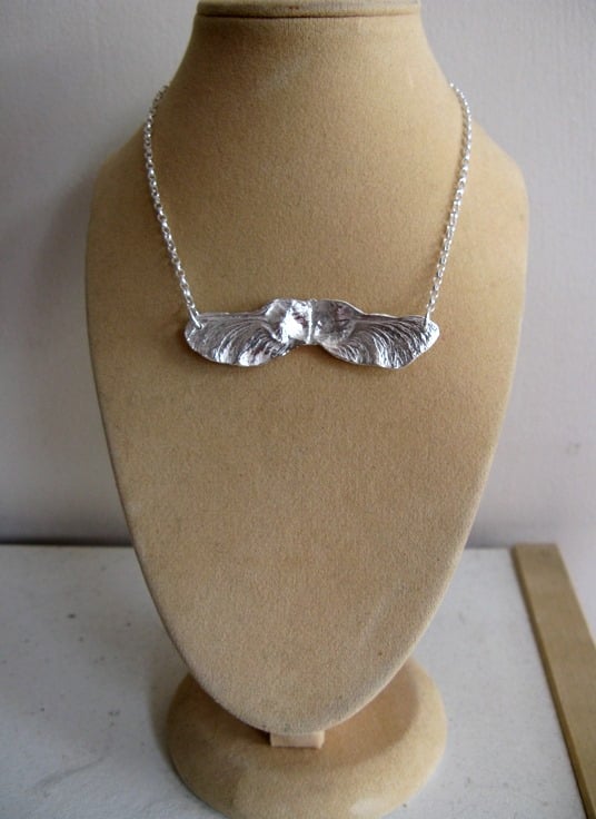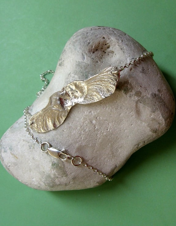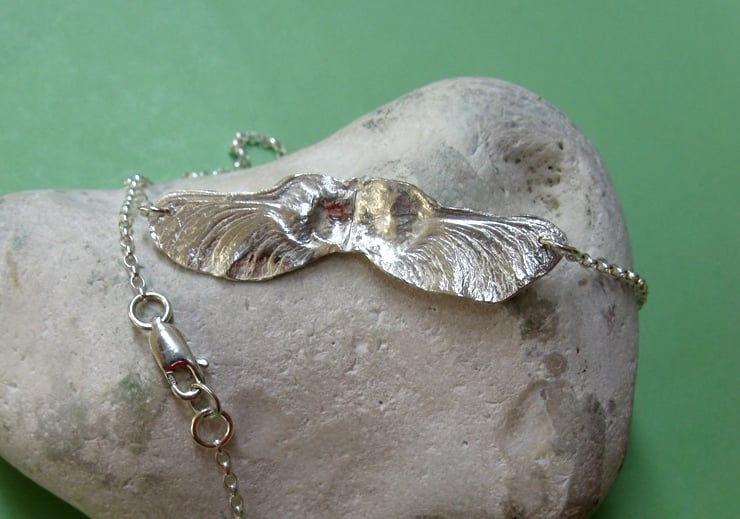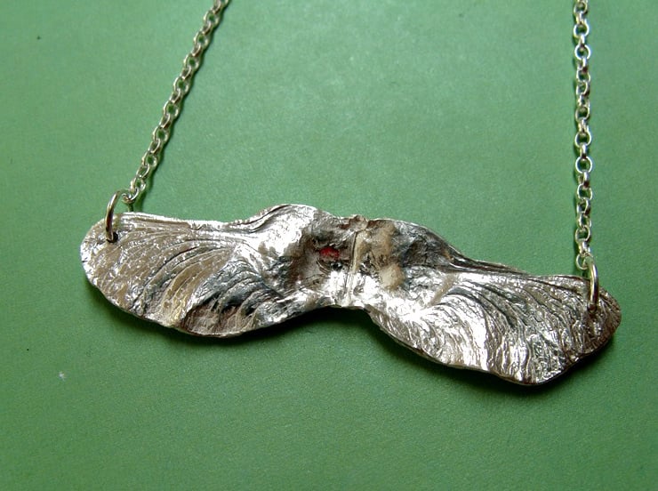 This stunning necklace was made by coating a real double sycamore seed in multiple layers of recycled fine silver (pure silver), leaving a detailed replica on the surface after firing.