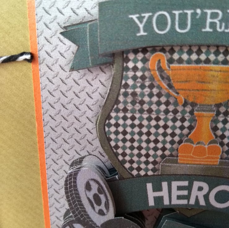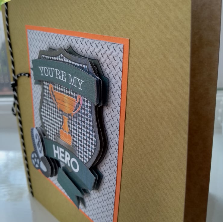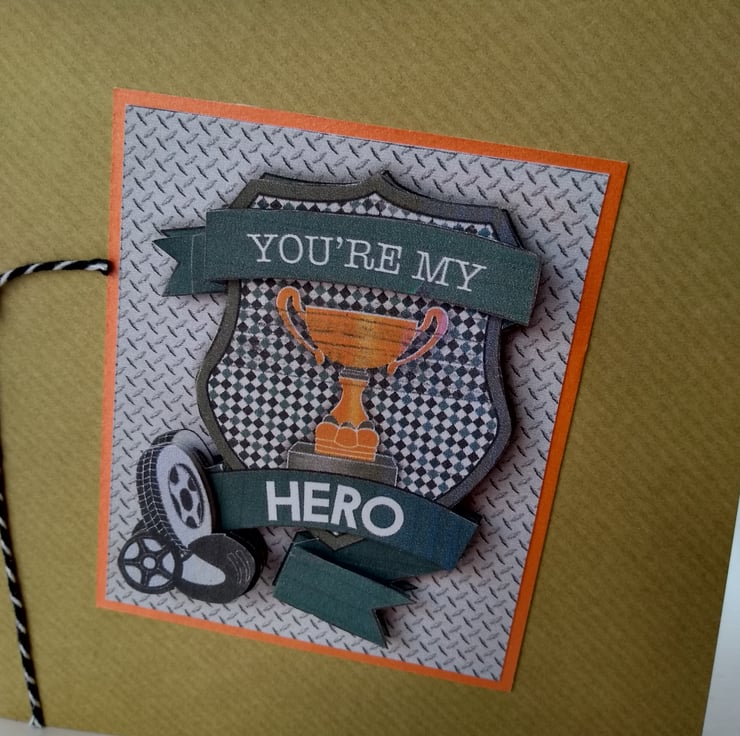 A completely handmade and uniquely designed card. Consisting of you're my hero decoupage mounted onto orange card and then onto quality brown paper love ok card. Finished off with black and white butchers twine.