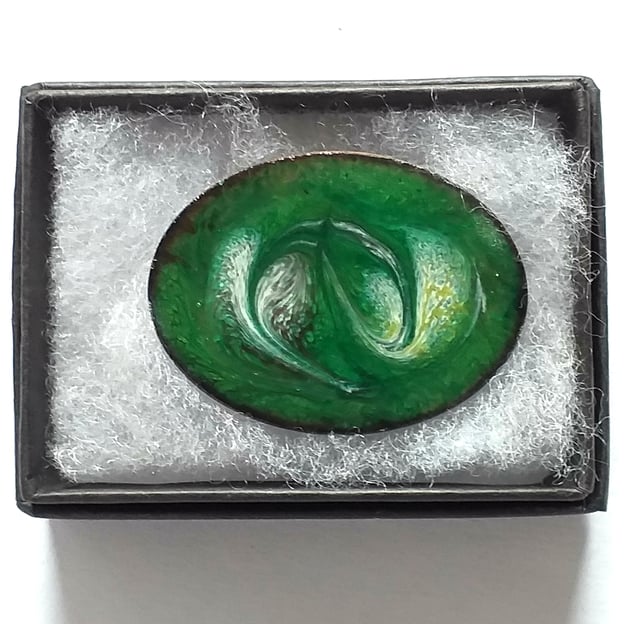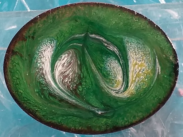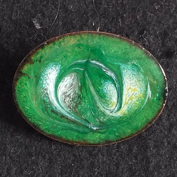After building up a base of clear enamel on the copper oval I added a layer of green. The copper beneath may be seen, shimmering through the green as the light strikes the brooch. I then scattered white, gold and purple enamel on the green and drew through the red hot surface to create the unique, random pattern you see.