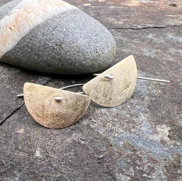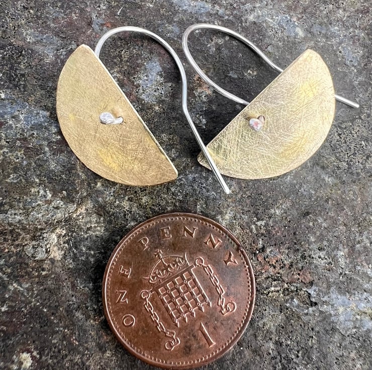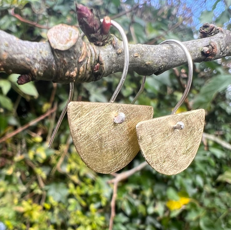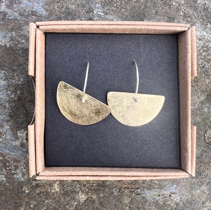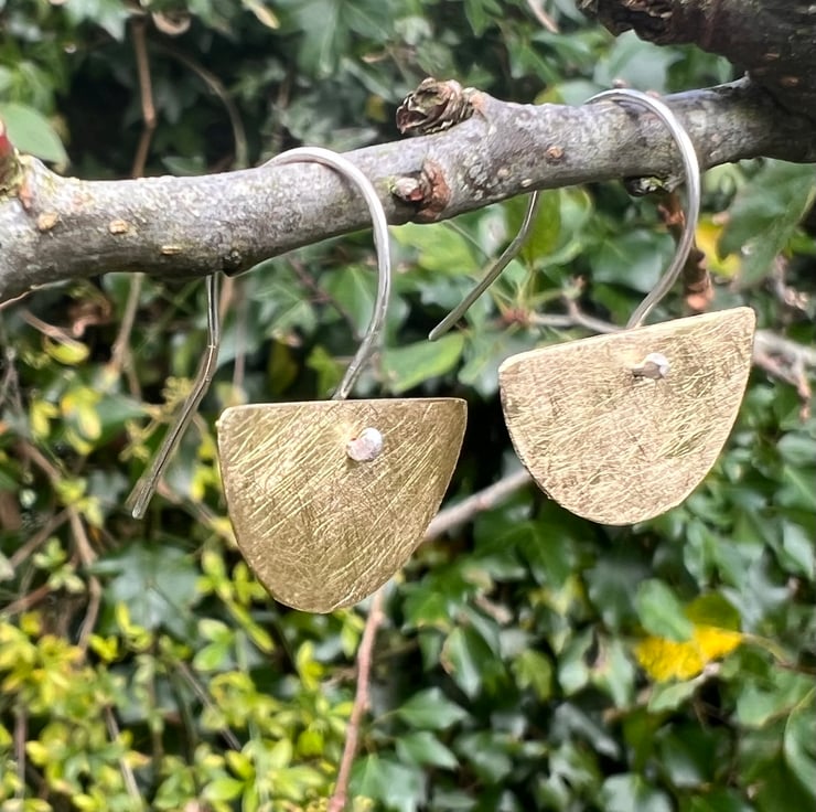I have cut out pieces of brass into half moon shapes and give them a matt , frosted surface texture. They hang from handmade ear hooks, made with sterling silver wire. The brass pieces are able to move about on the ear hook so that they catch the light. The have a dangle of 25mm / one inch