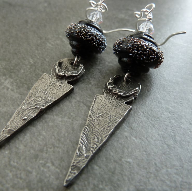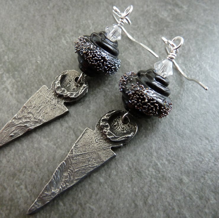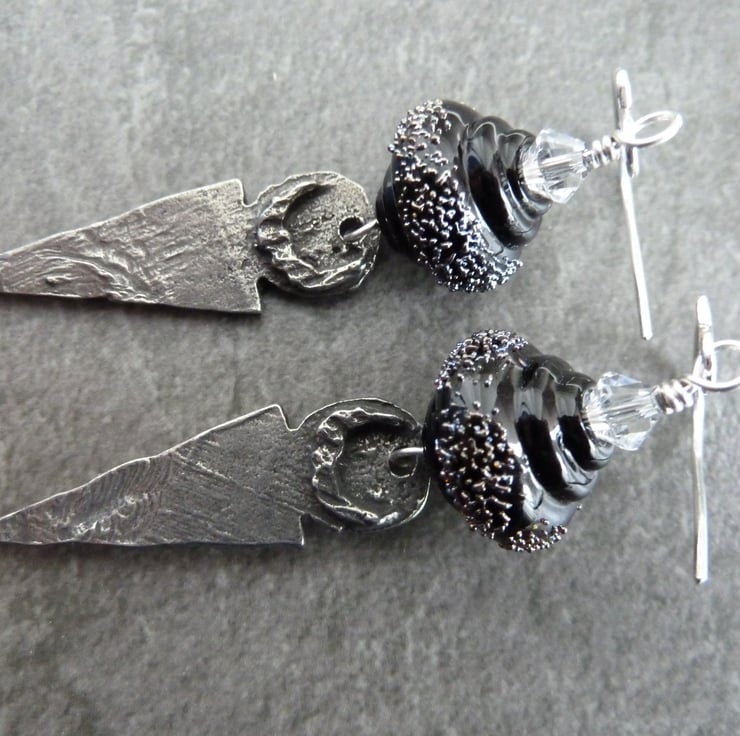 A pair of earrings made with handmade sterling silver ear wires, handmade lampwork glass beads made with black and silver glass and handmade pewter drops.