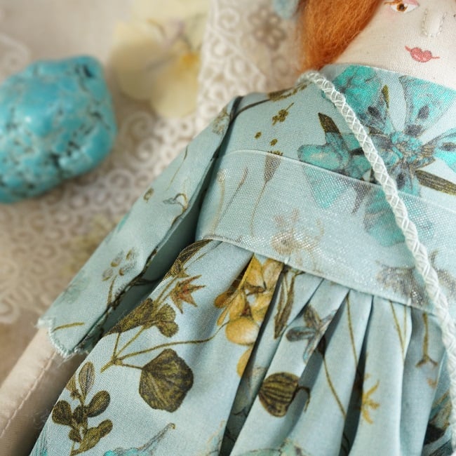 She is dressed in Floral Eve, a wonderful rich Liberty Lawn fabric in shades of aqua blue and warm yellows and finished with an aqua organza ribbon. Her outfit is completed with tiny buttons, leather shoes and a portrait of her cat on her little sachet. She has co-ordinating knickers and underskirts in cotton and lace.