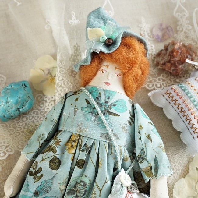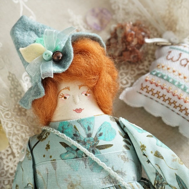 Waverly is a little witch doll made to my Milly Doll Pattern here in Lancashire. She has a hand painted, hand embroidered face with rich red wool tops for hair. Waverly is softly stuffed with lavender in her stuffing for a gentle scent and a piece of turquoise at her heart for strength.
