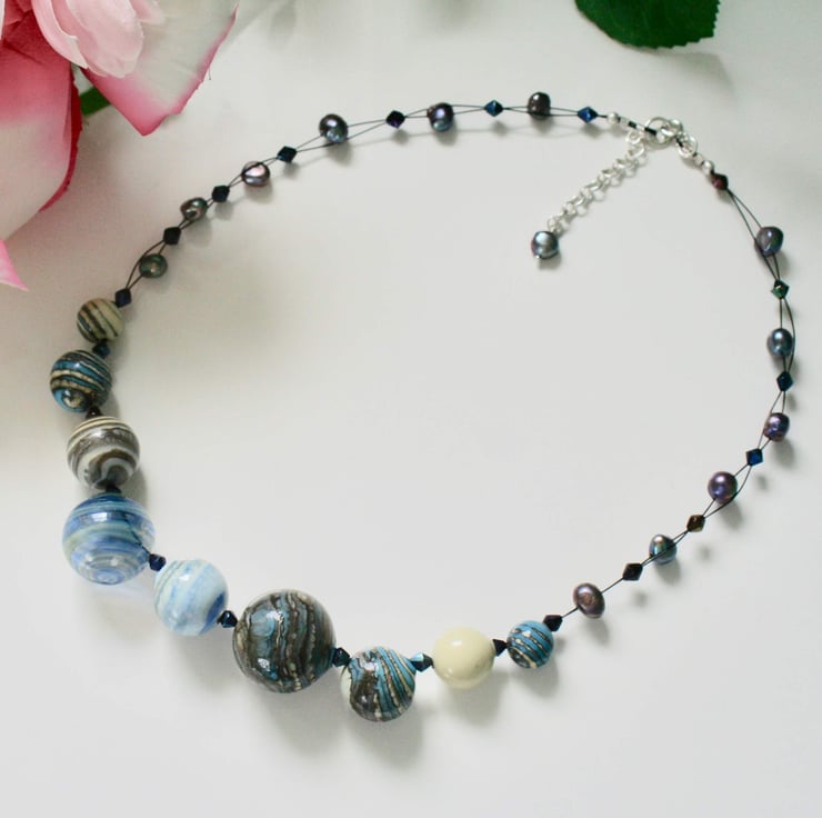 An unusual and completely unique necklace made with beautiful blown glass beads (Earthshine beads) and purple baroque pearls that have been strung on a double strand of black necklace wire and interspersed with purple bicone beads.