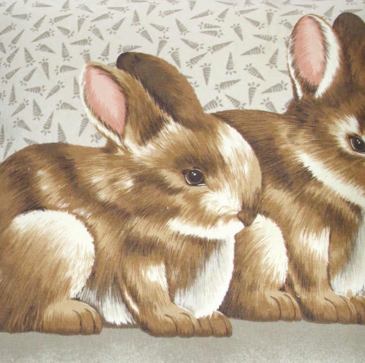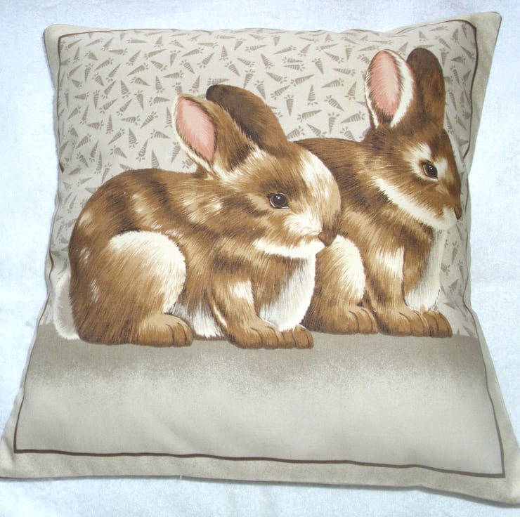 A square cushion with two little brown bunnies sitting on a beige and brown background, behind them there are lots of outlines of carrots on a light brown backing, it looks like they are actually sitting on a cushion.