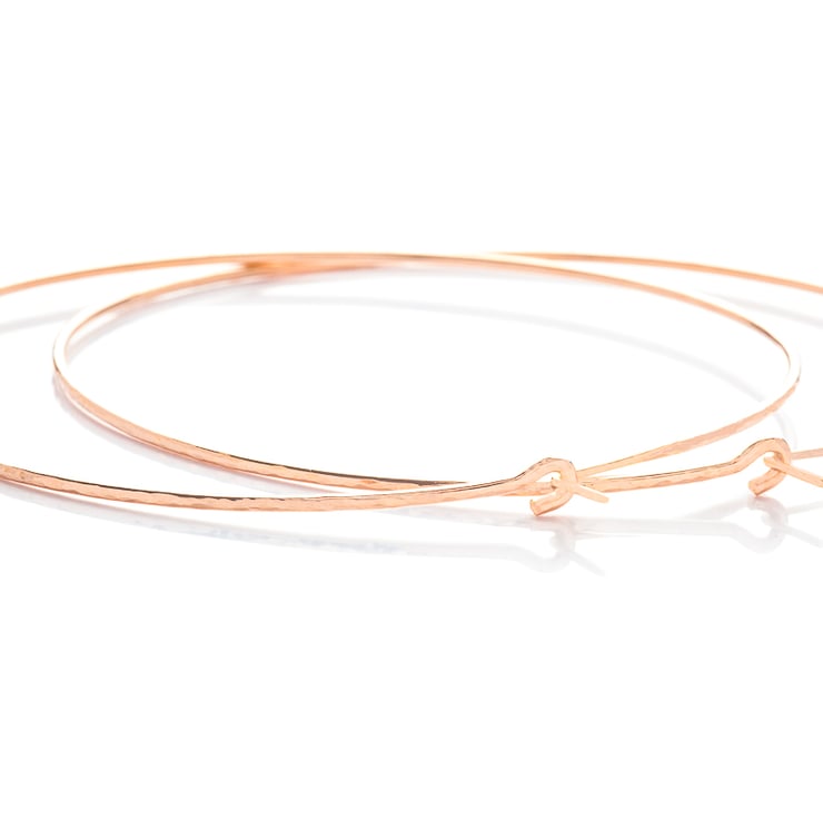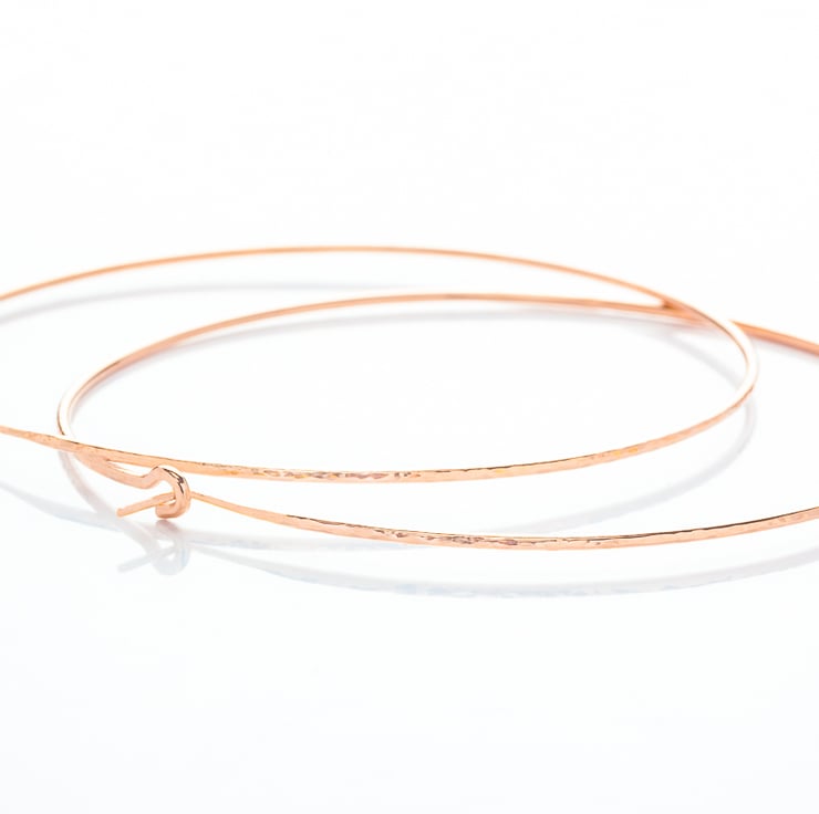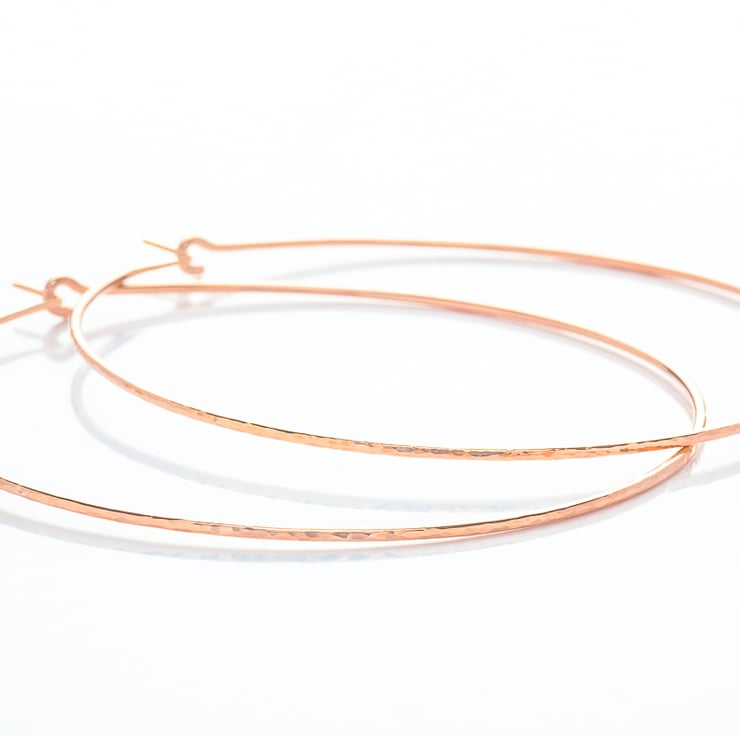 Handmade Rose Gold Filled Extra Large Hoop Earrings are made from 16 gauge (1.30 mm) 14K Rose Gold Filled wire, hand forged and hand textured to approximately 75mm (3 inches) diameter. For the ear posts, they are hand filed to 20 gauge (0.8mm) for a comfortable fit. The Earrings have been tumbled for strengthening and a polished, smooth finish.