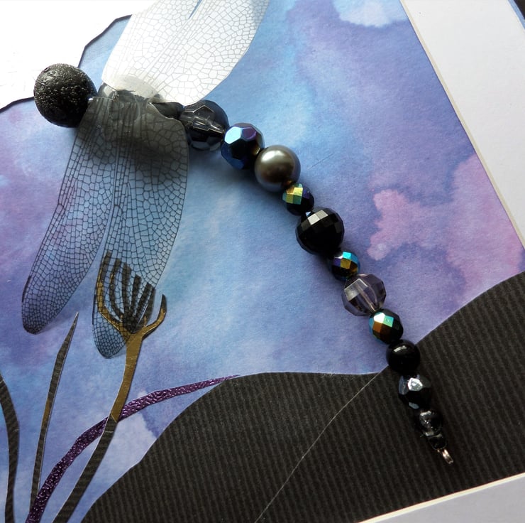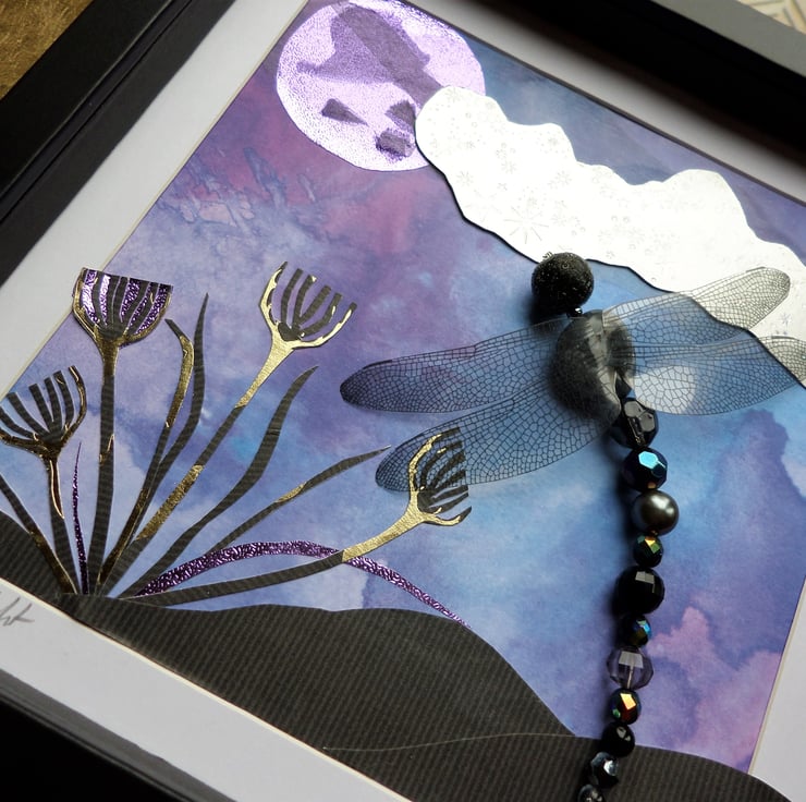 The beautiful black dragonfly is made of mainly new beads in a combination of acrylic crystal, pearl and iridescent glass giving glints of turquoise and gold. The wings are printed on acetate. Below is a landscape in shadow with umbellifer plants silhouetted and touched with flashes of gold and purple cut from recycled card. Everything is mounted against a richly coloured printed background.