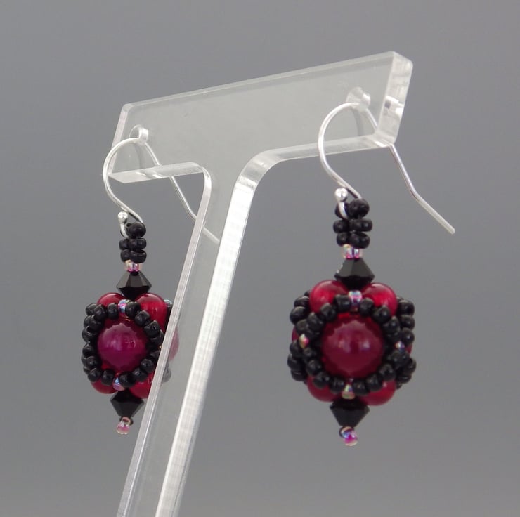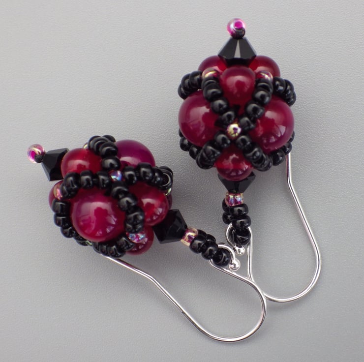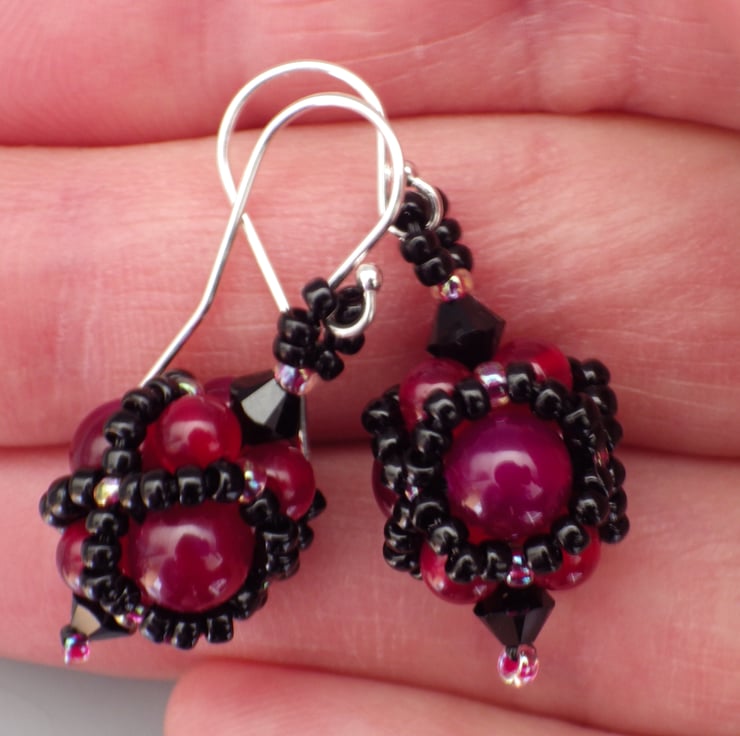 These gloriously gothic earrings have been made featuring dyed fuchsia pink agate beads in two sizes as their centrepiece. I have embellished them using quality Japanese seed beads in a beadwoven netting in shiny black and dark pink colours but allowed the semiprecious beads to remain visible. Teamed with fabulous Swarovski crystals, they are finished using Sterling Silver findings.