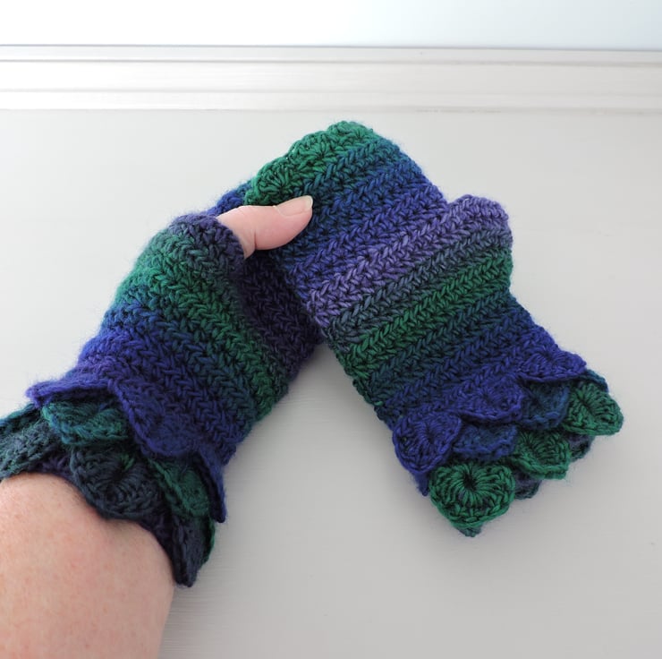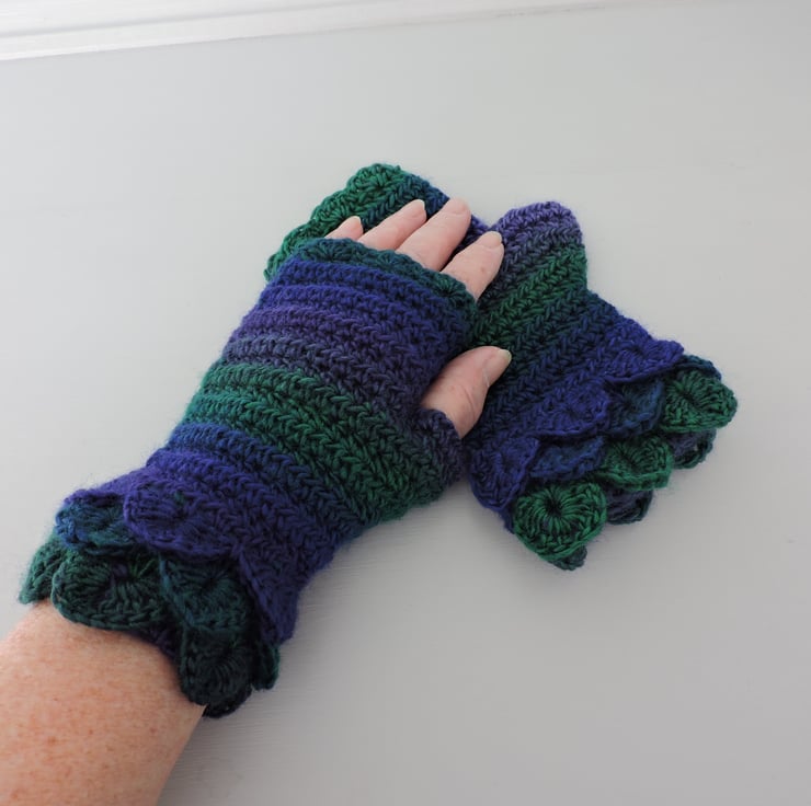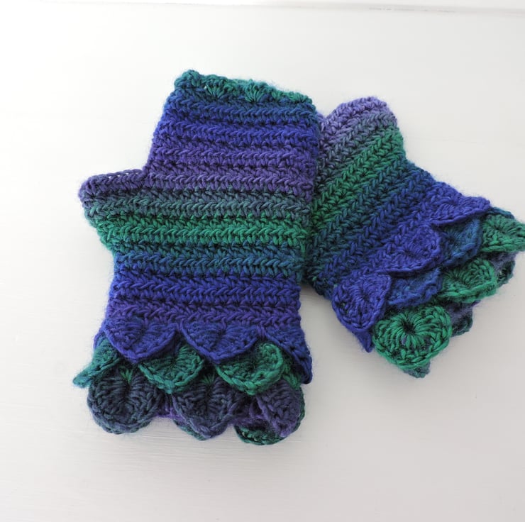 Multi tonal colours of emerald green, navy blue and purple . Dragon Scales cuffs and a plain body with a wavy edge finish at the top..