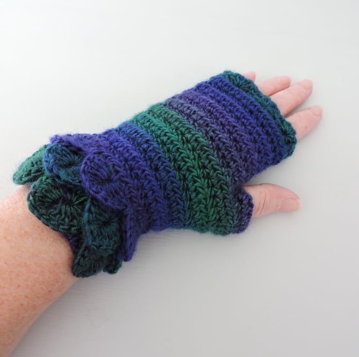 These eye catching crochet adults fingerless mittens, wrist warmers have been made with a graduated colour acrylic yarn.
