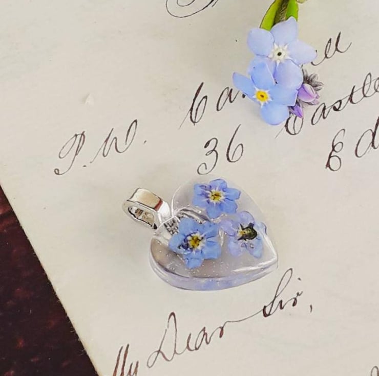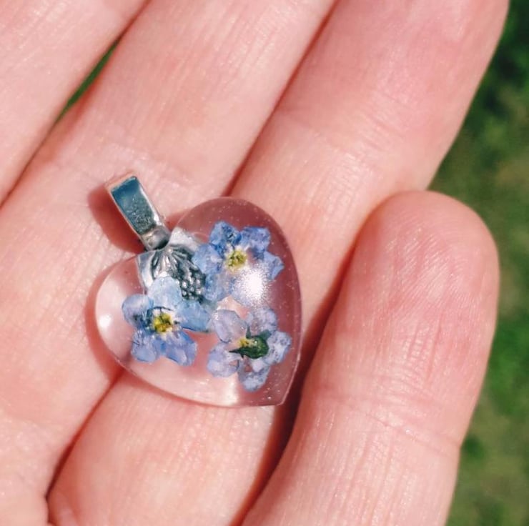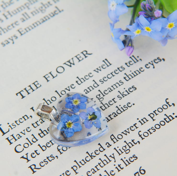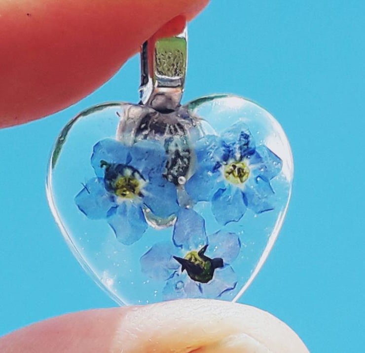 Heart necklace with real forget me not flowers.