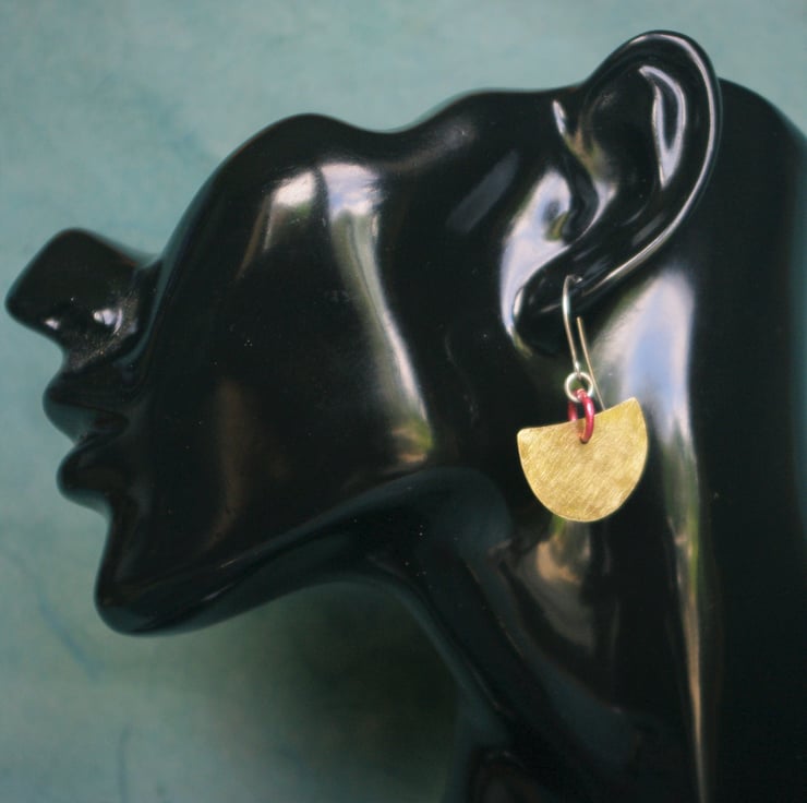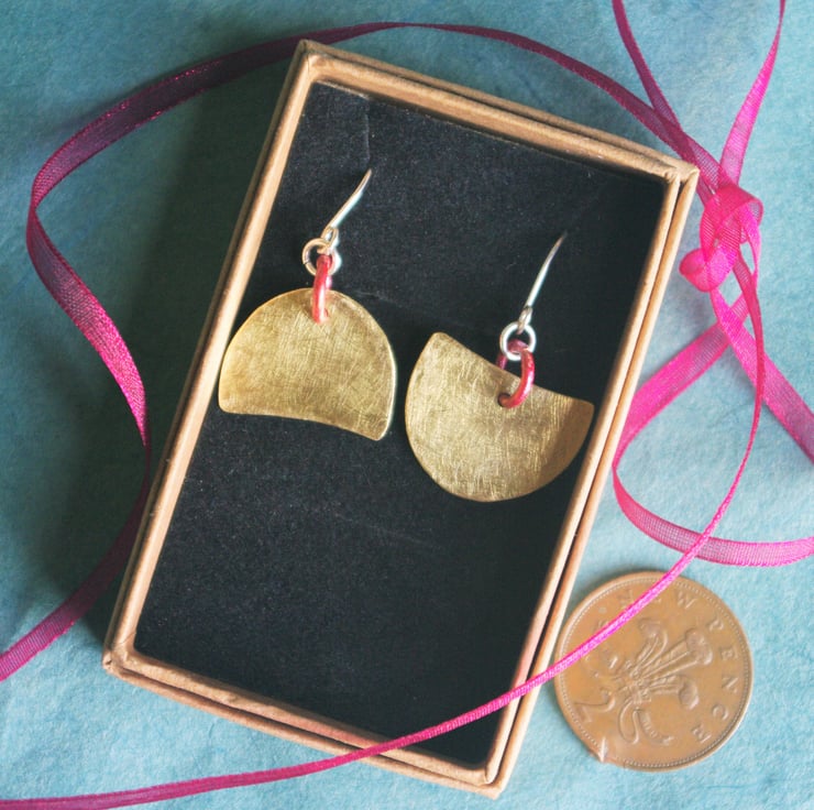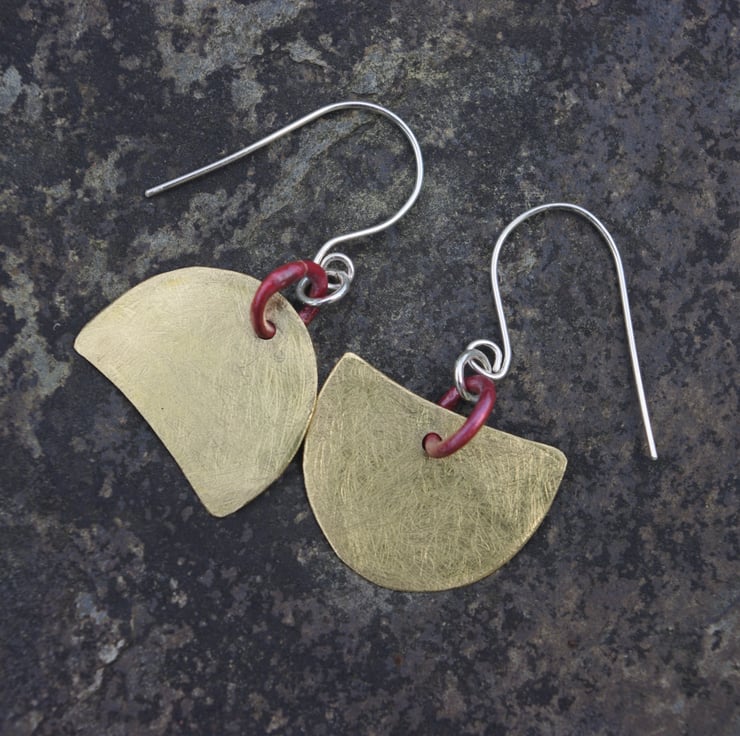 I have given the surface a matt, frosted finish. They hang from chunky copper jump rings , which have been treated with heat to give luscious red tones and some texture. This colour contrasts well with the brass and as I have hung one of them the other way round , attention will be drawn to these statement earrings